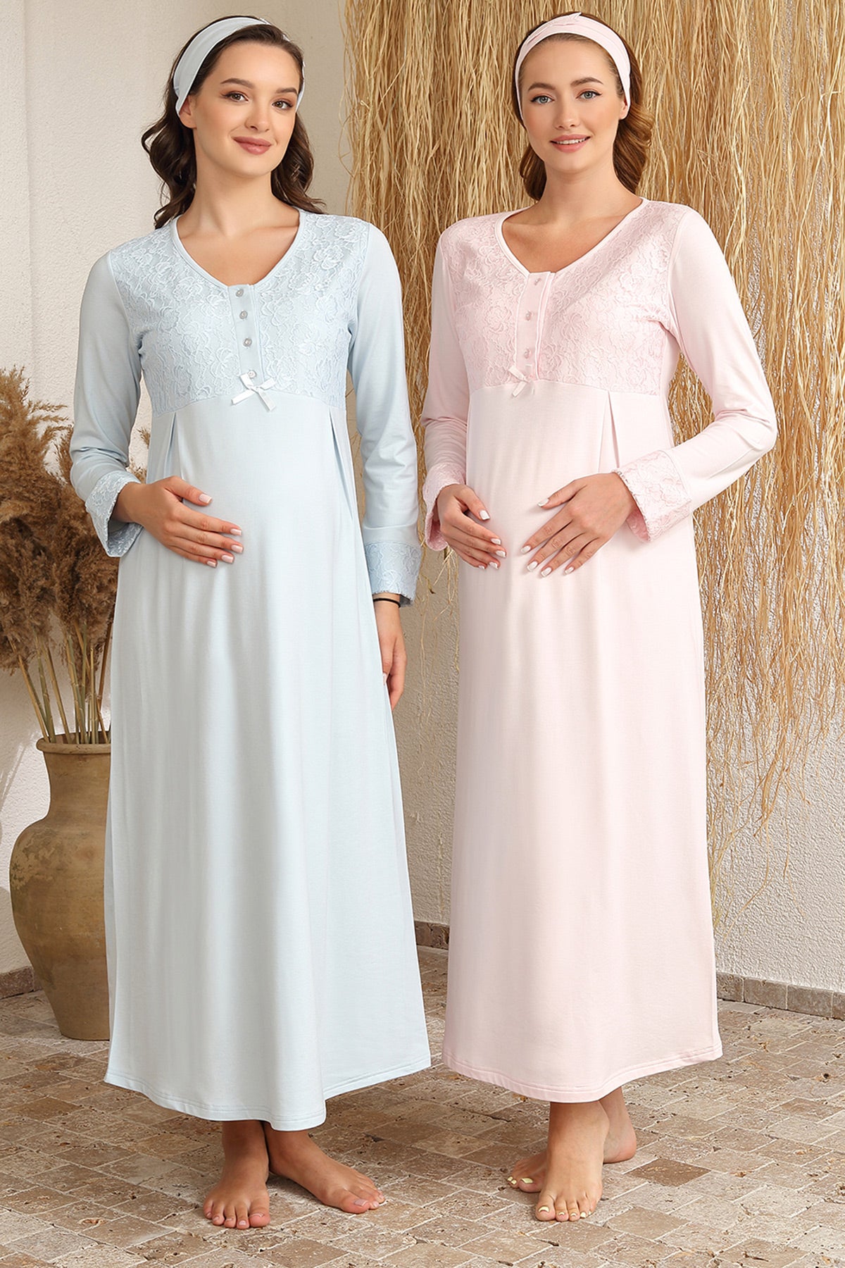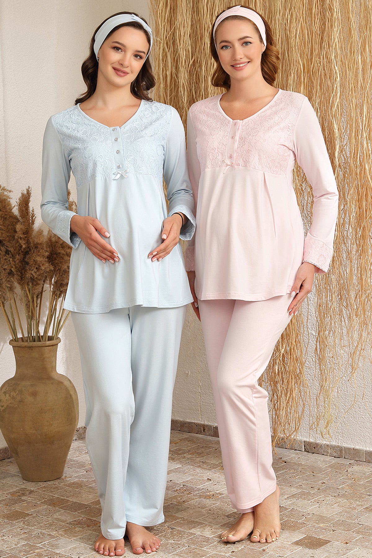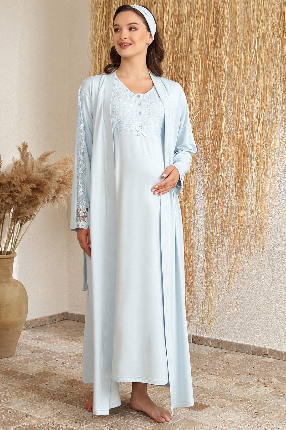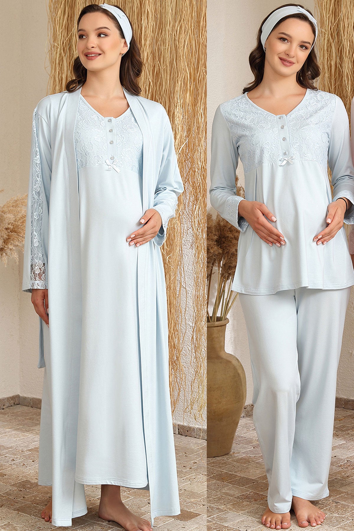 The Shopymommy 440204 Lace Sleeve 4 Pieces Maternity & Nursing Set in Blue is the perfect blend of style, comfort, and functionality for expecting and new mothers. Crafted from the highest quality organic fabric, this set prioritizes your comfort and health during one of the most beautiful yet challenging times in your life. The soft and breathable material ensures that you feel great throughout your pregnancy and postpartum journey.