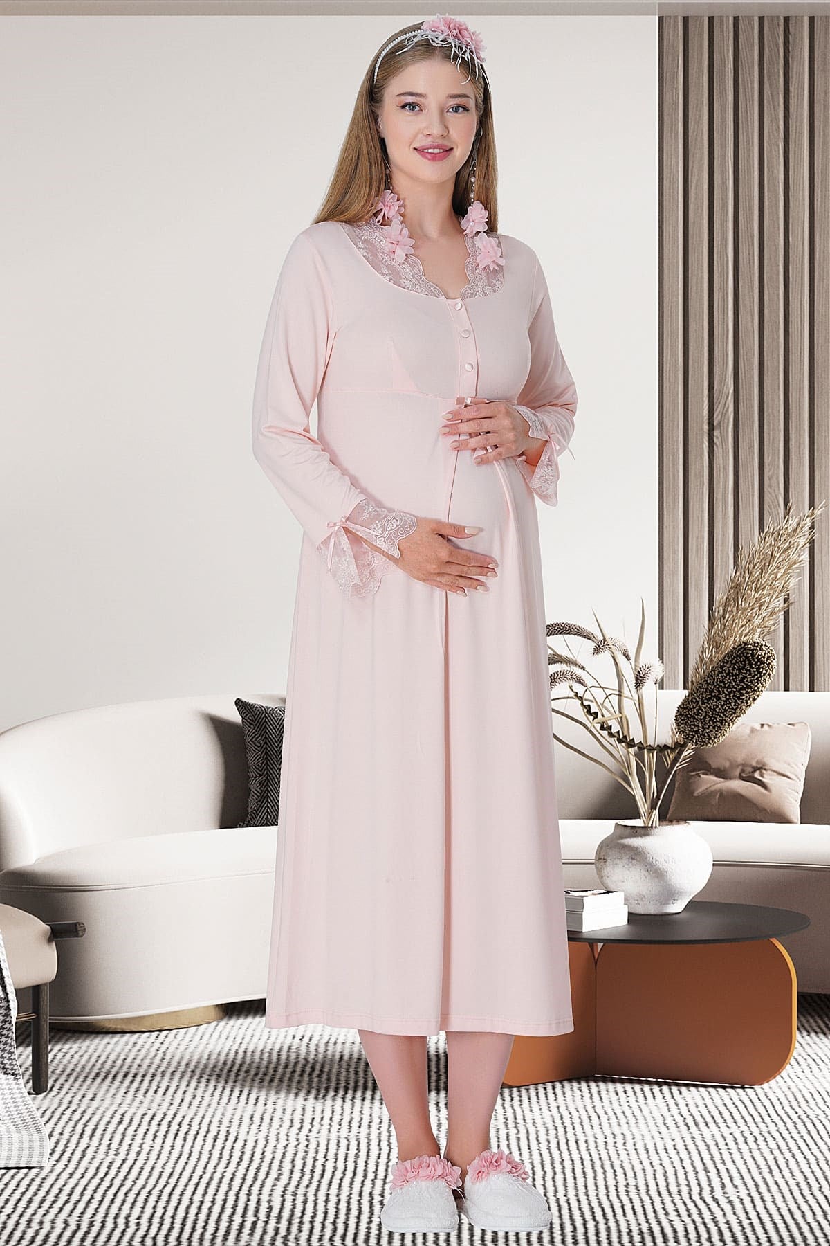 The Shopymommy 5312 Lace Sleeves Maternity & Nursing Nightgown in Powder is the perfect blend of style, comfort, and functionality for expecting and new mothers. Crafted from the highest quality organic fabric sourced from Turkey, this nightgown prioritizes your comfort and health, ensuring you feel great while looking fabulous. Whether you're in the later stages of pregnancy or navigating the postpartum period, this nightgown is designed to meet your needs.