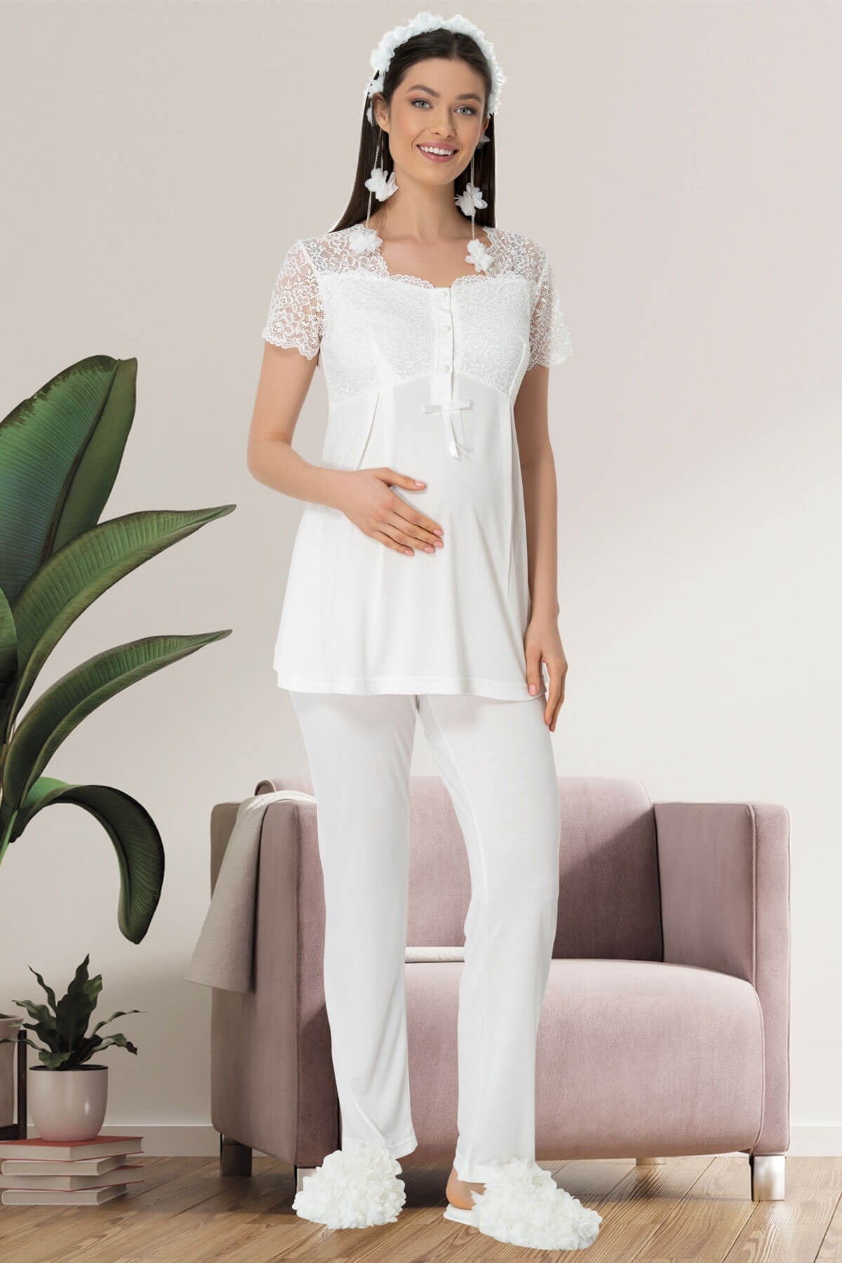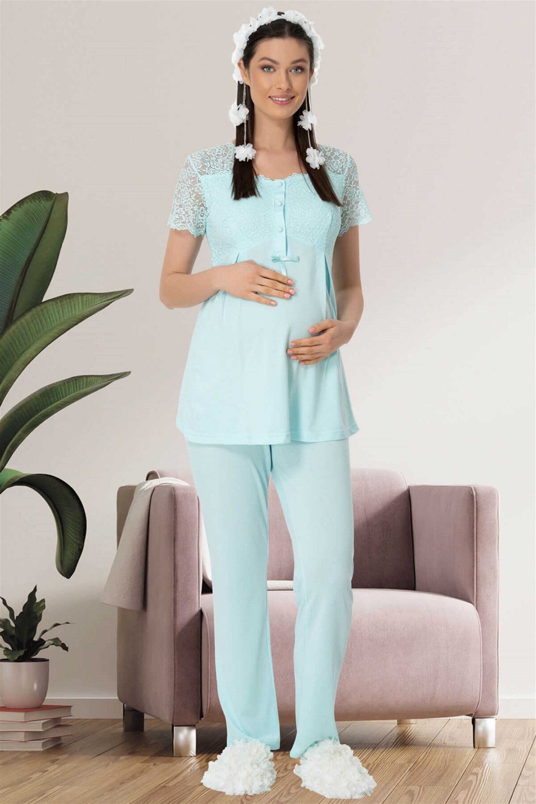 Introducing the Shopymommy 5422 Lace Sleeve Maternity & Nursing Pajamas, a perfect blend of style, comfort, and functionality for expecting and new mothers. Crafted from the highest quality organic fabric sourced from Turkey, these pajamas are designed with your comfort and health in mind. The soft and breathable material ensures that you feel cozy throughout the day and night, making it an ideal choice for both pregnancy and nursing.