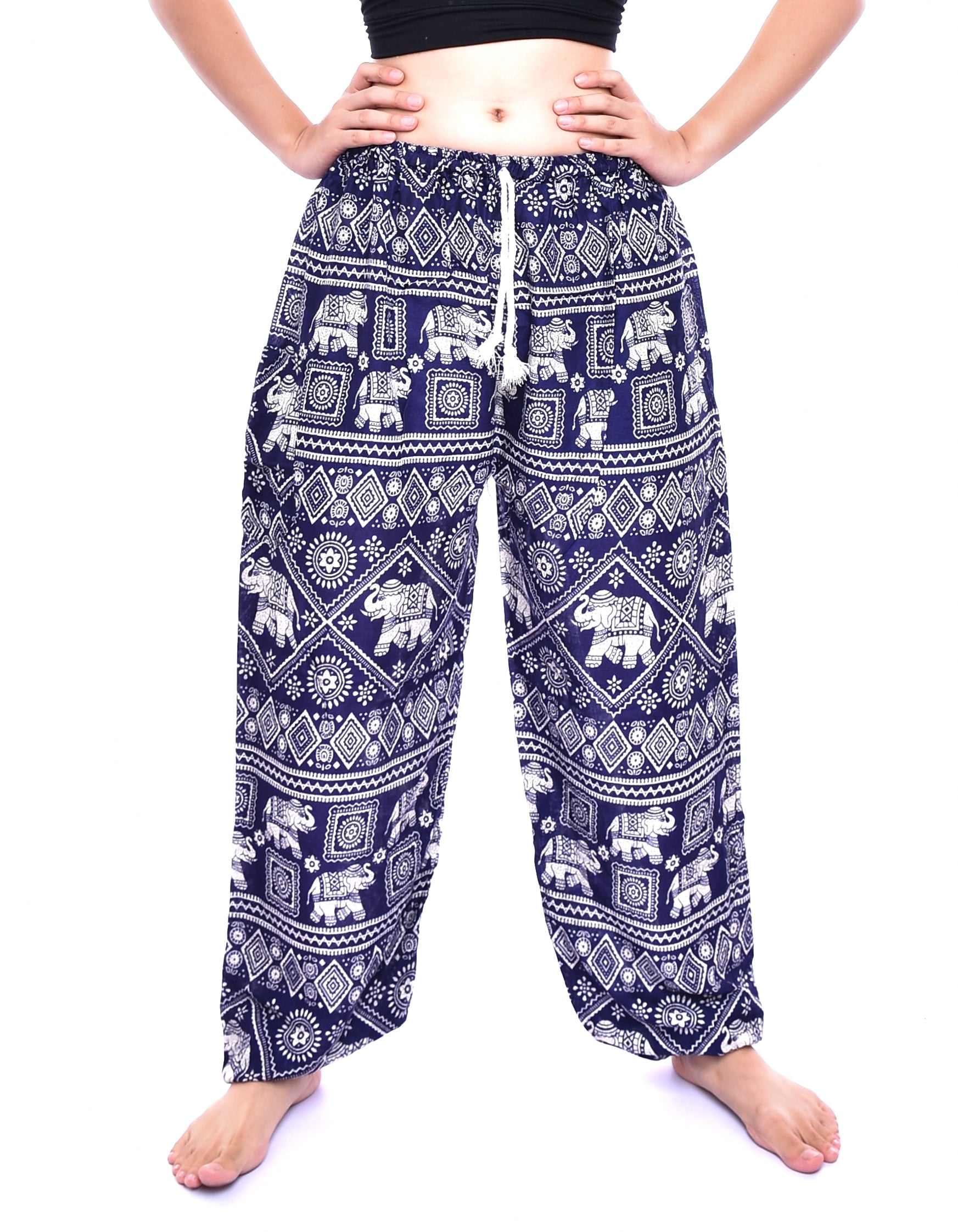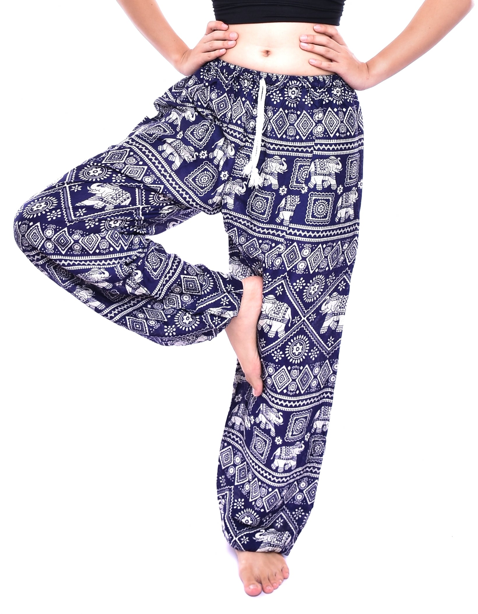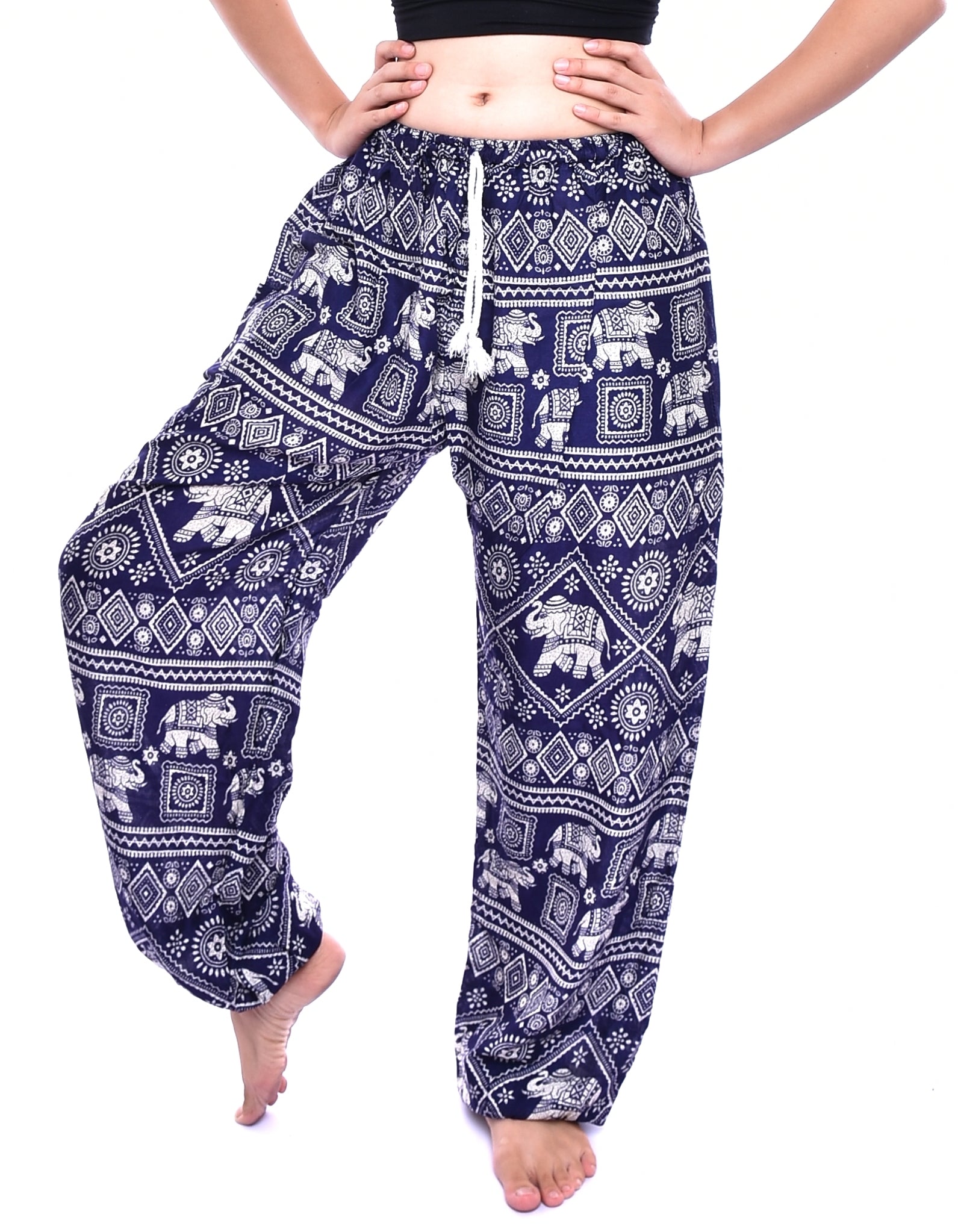 The navy blue elephant print adds a unique touch to your wardrobe, making these pants a standout piece. They are perfect for a variety of occasions, including yoga sessions, casual outings, beach days, and even music festivals. Pair them with a simple tank top or a stylish blouse for a chic look.
