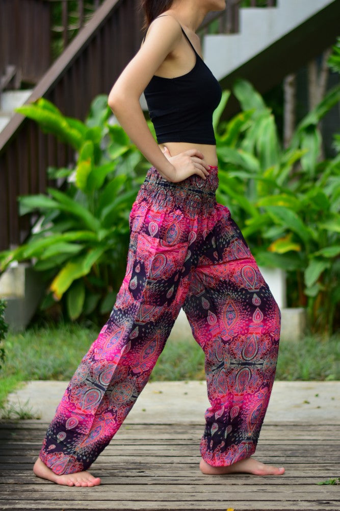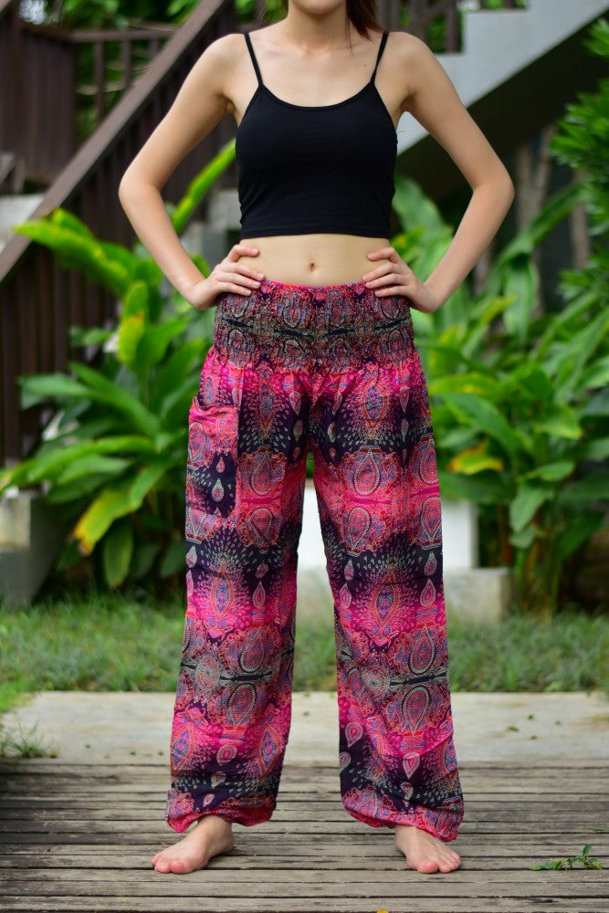 Introducing the Bohotusk Pink Teardrop Print Elasticated Smocked Waist Women's Harem Pants, a perfect blend of comfort and style. These beautifully crafted trousers are handmade in Thailand, ensuring high-quality craftsmanship and unique designs. Made from 100% Super Soft Rayon material, these harem pants are lightweight yet strong and resilient, making them an ideal choice for various occasions.