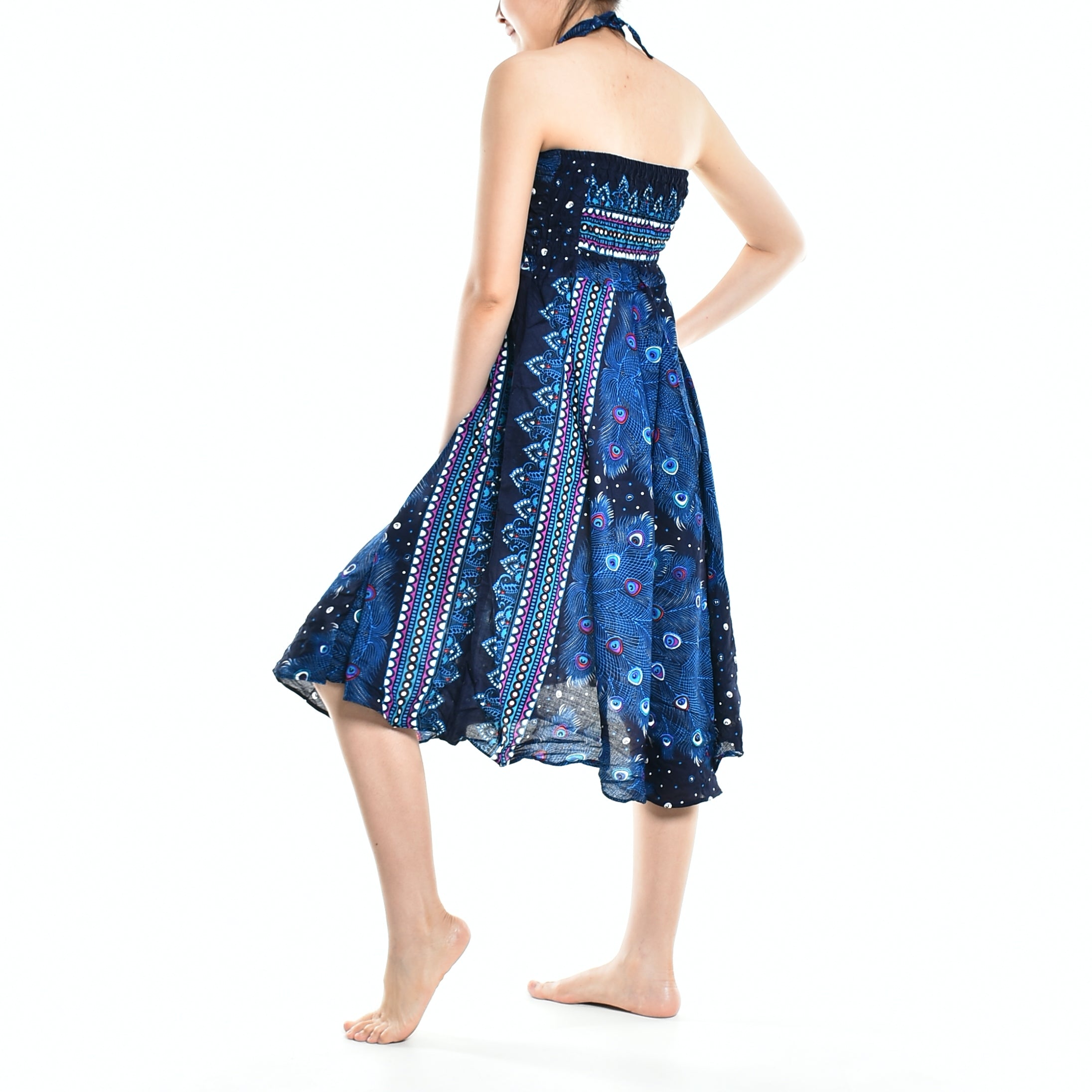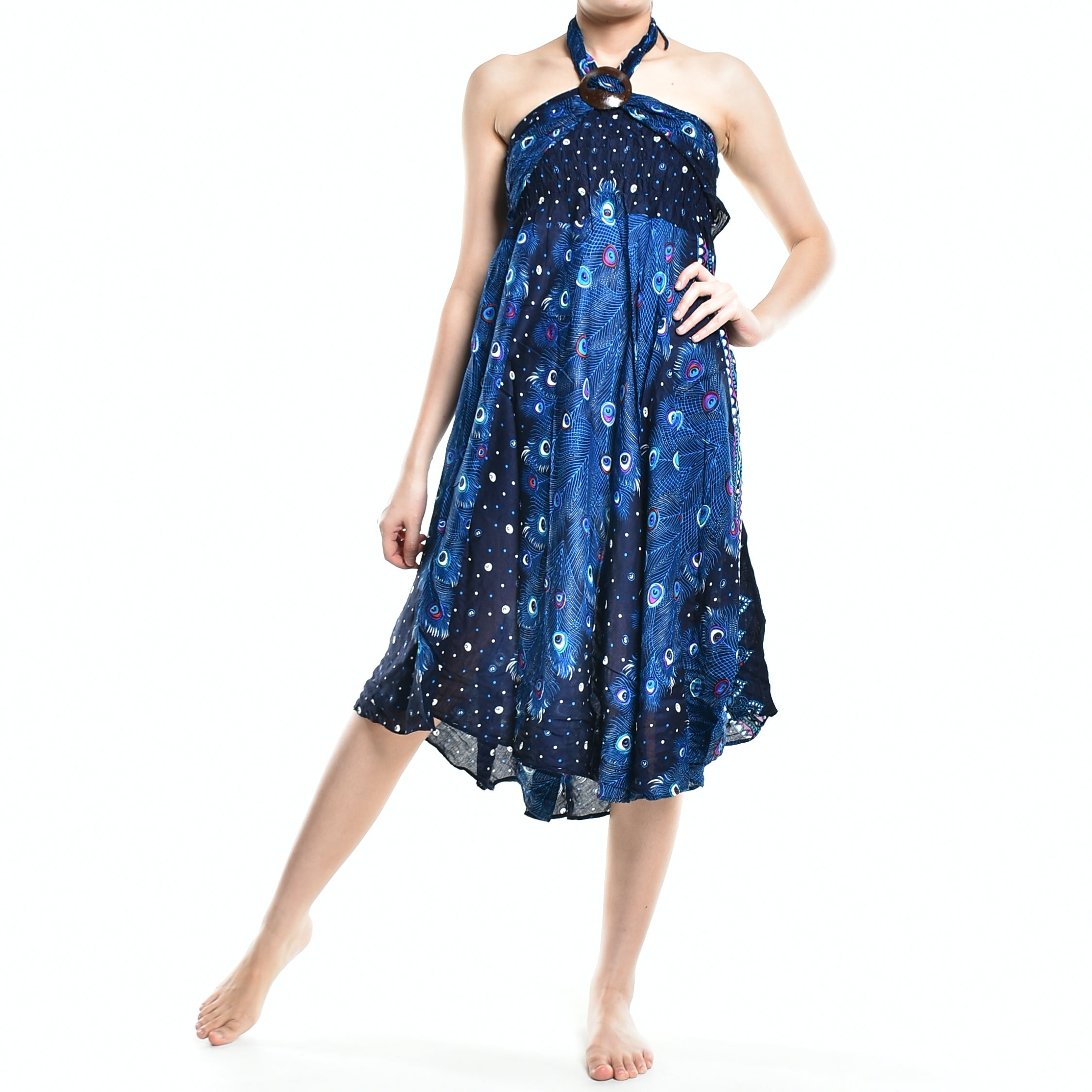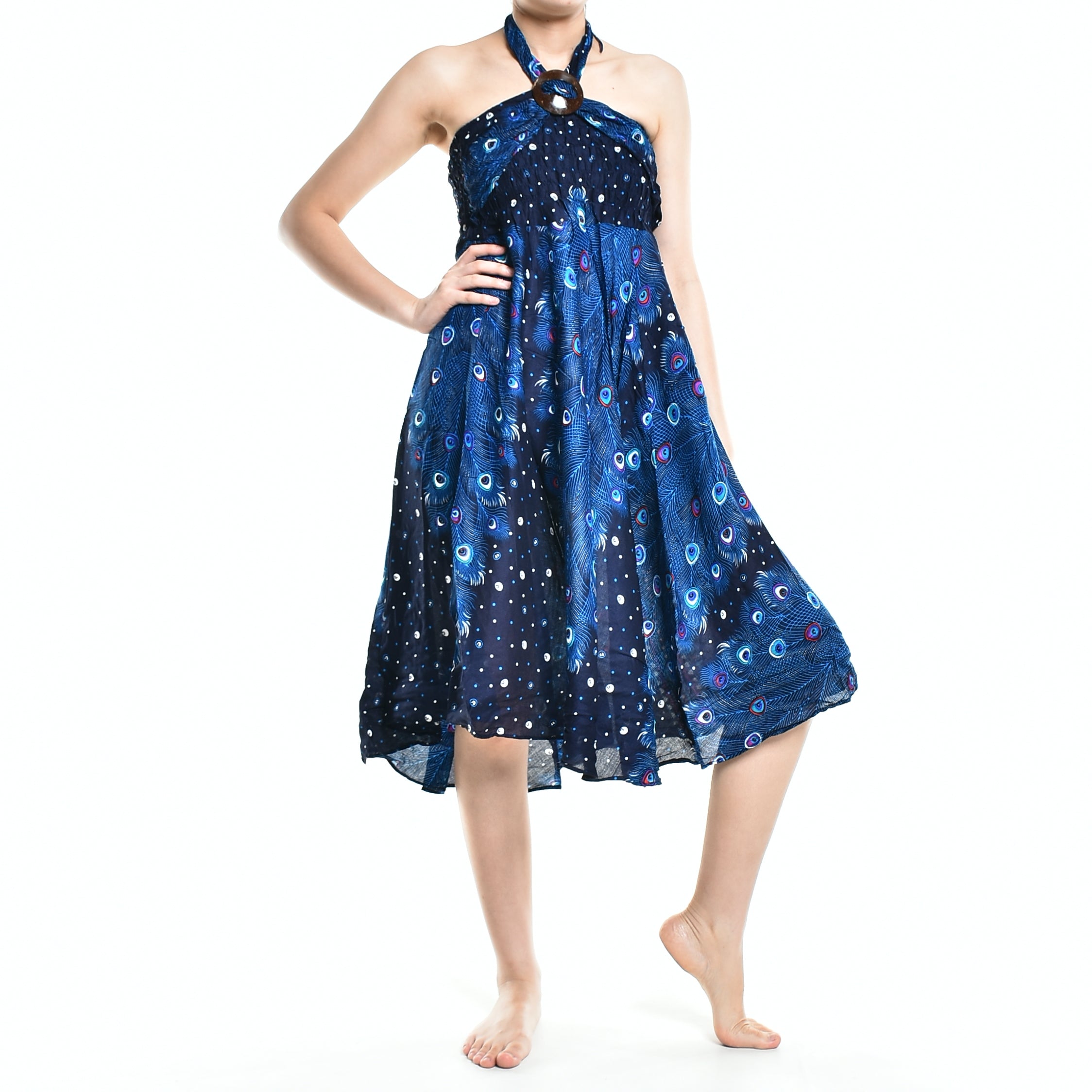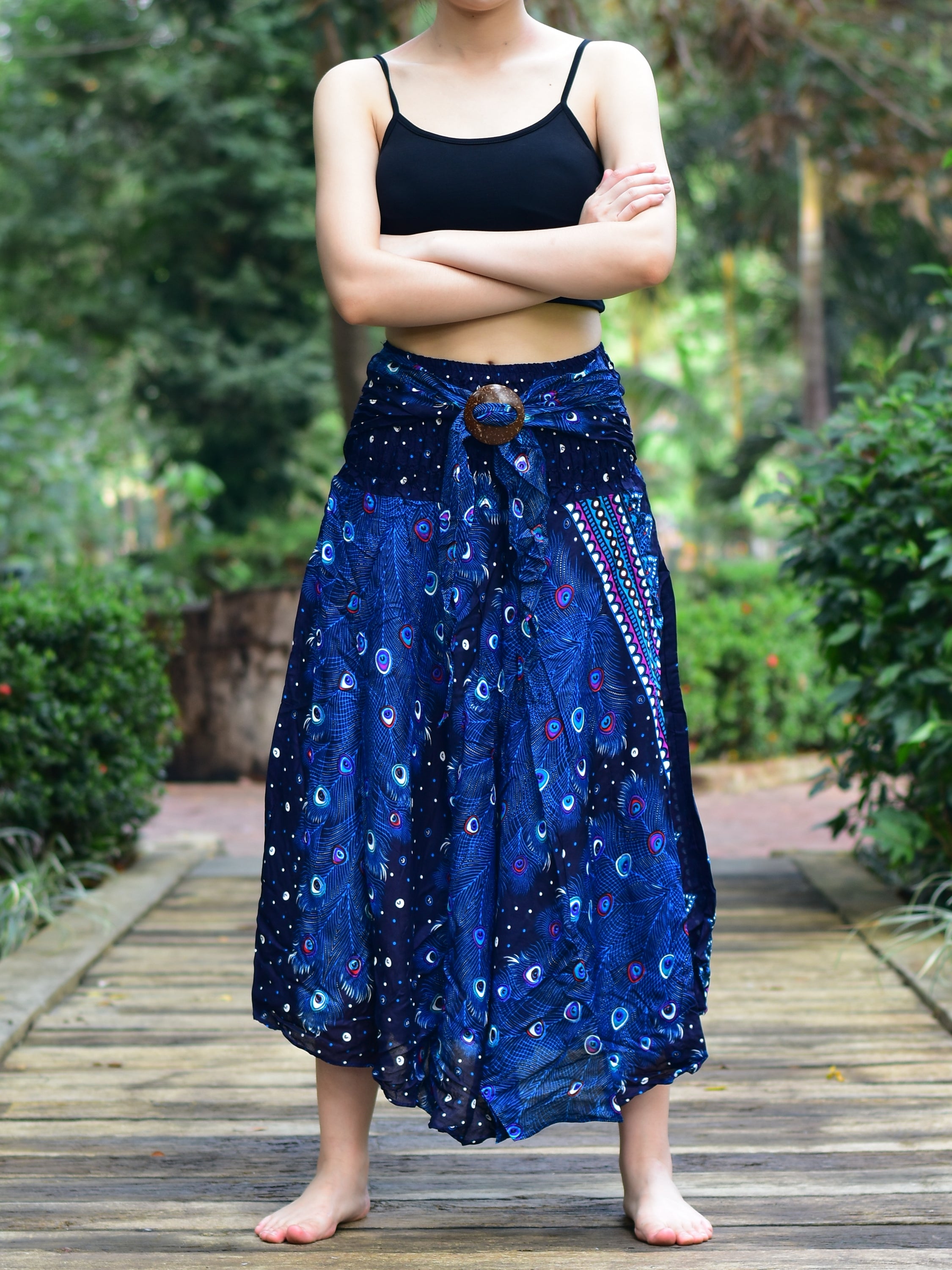 This versatile skirt can be styled in numerous ways. Pair it with a simple tank top for a casual day out, or dress it up with statement jewelry and heels for an evening event. The beautiful blue peacock print adds a pop of color to any outfit, making it a fantastic choice for summer parties, beach outings, or even casual brunches.