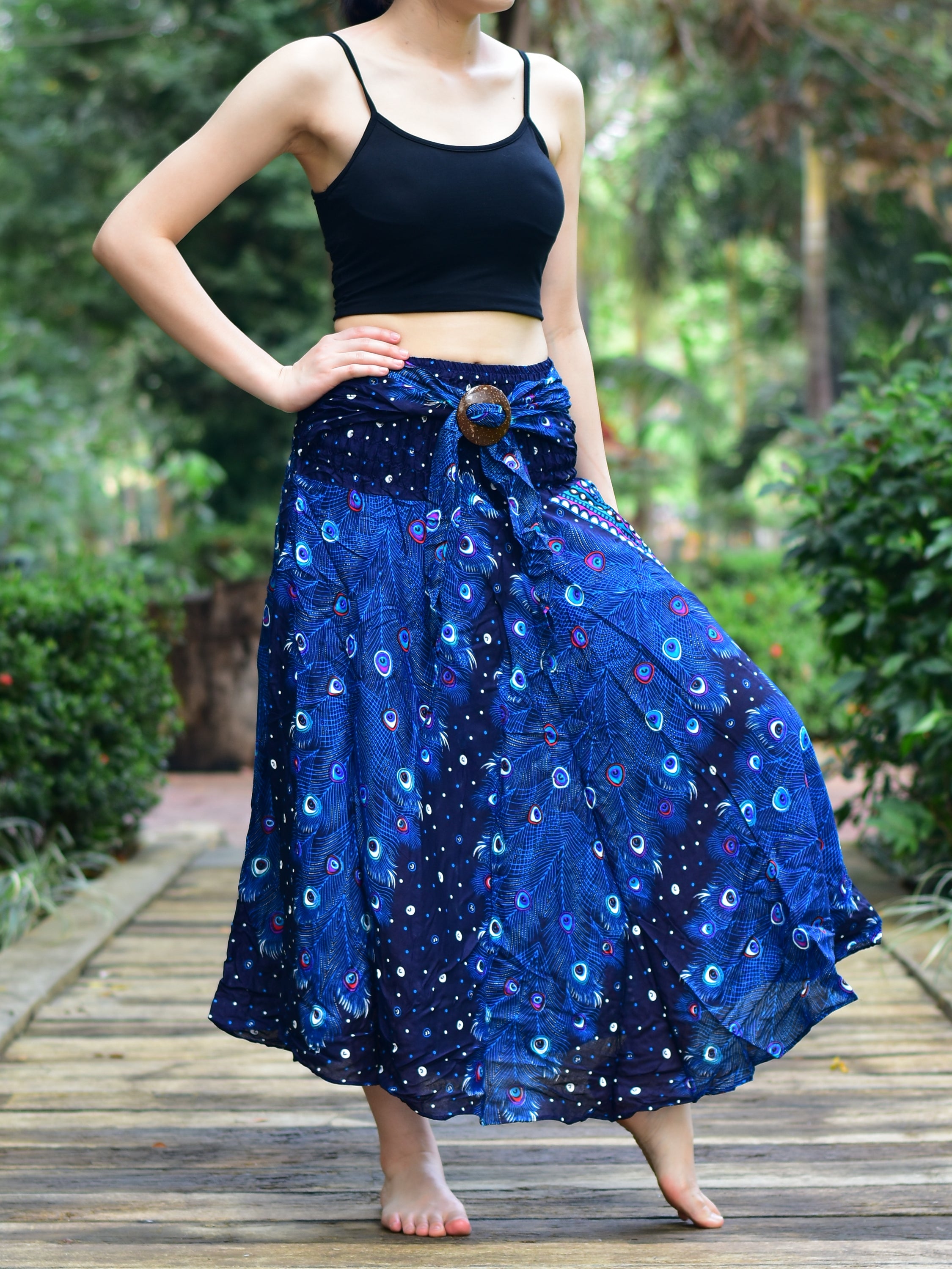 Introducing the Bohotusk Blue Peacock Long Skirt with Coconut Buckle, a stunning addition to your wardrobe that combines elegance and versatility. This unique piece can be worn as a flowing long skirt or transformed into a chic strapless dress, making it perfect for various occasions. The elasticated smocked waist ensures a comfortable fit, allowing you to move freely while looking fabulous.