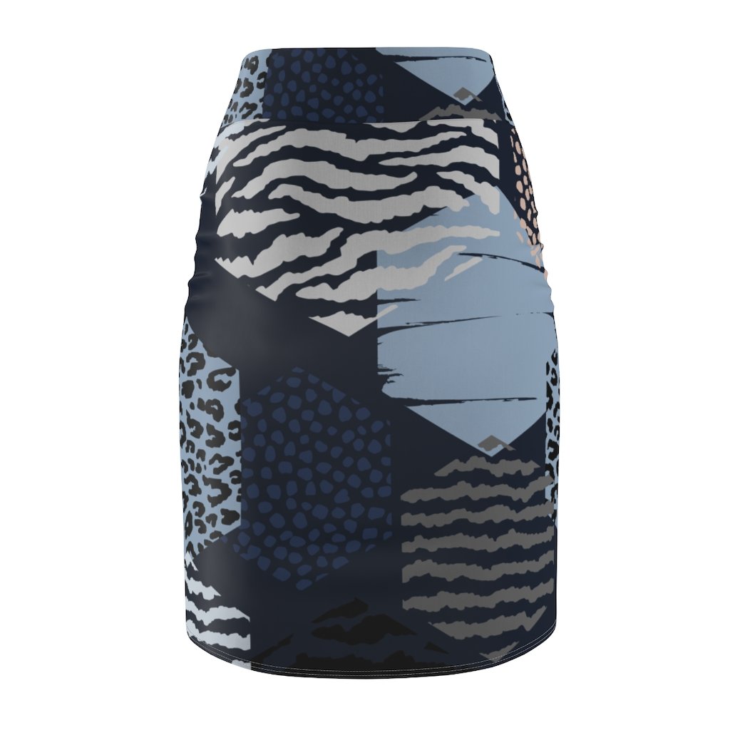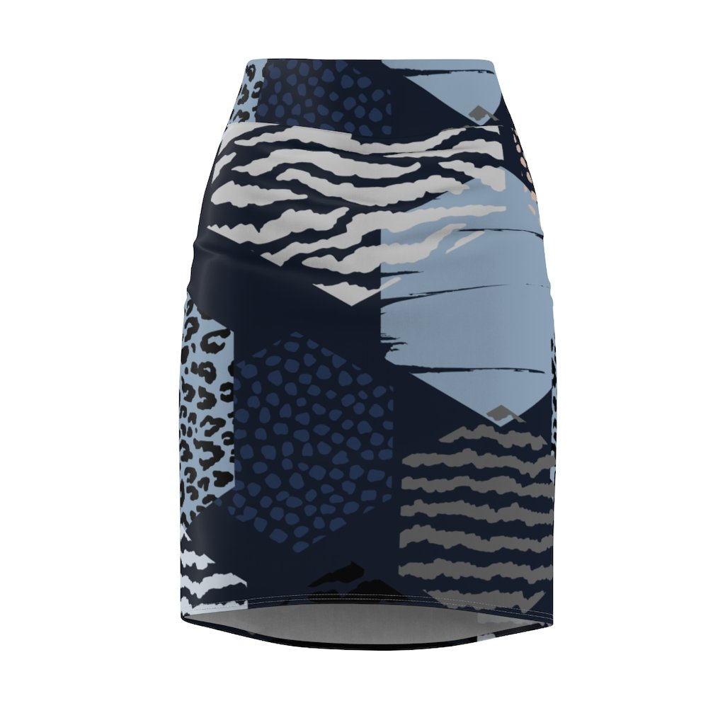 Introducing our Women's Pencil Skirt in a stunning Geometric Blue design, crafted for comfort and style. This high waist stretch pencil skirt is tailored to hug your curves while providing the flexibility you need for all-day wear. Made from a blend of 95% polyester and 5% spandex, it offers a soft touch against your skin and a flattering silhouette that enhances your figure.
