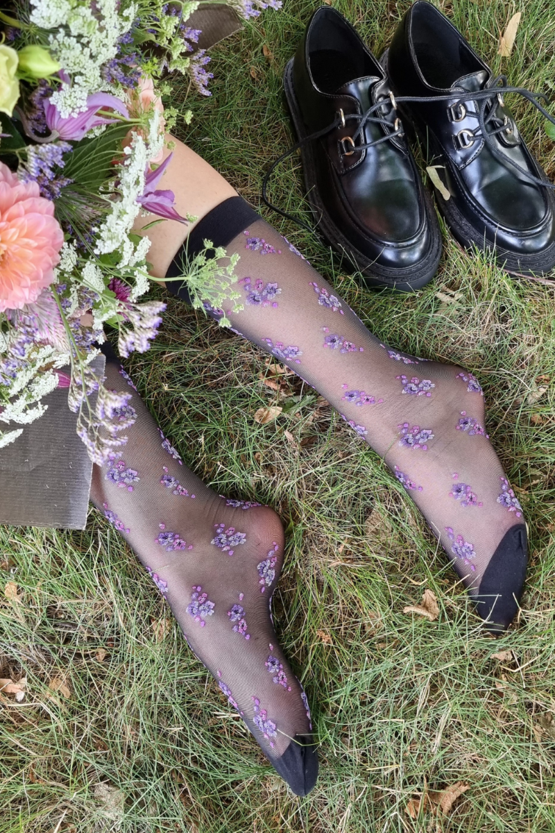 The sheer black fabric of the ARINA socks allows for breathability while maintaining a chic appearance. Whether you're dressing up for a formal event or looking for something stylish for everyday wear, these socks will complement your shoes beautifully. The delicate floral pattern in purple adds a unique flair, making these socks a standout piece in your wardrobe.