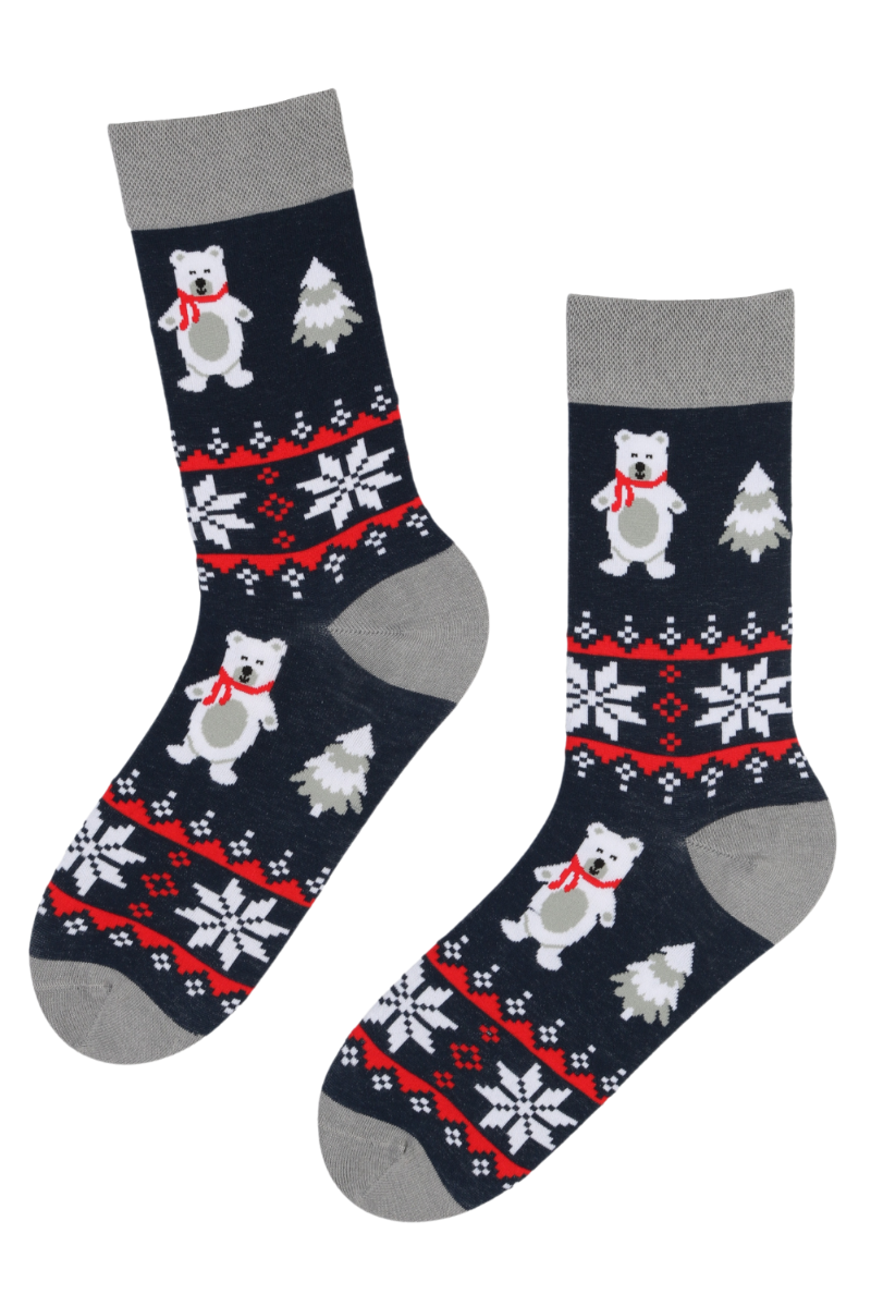 Dark blue socks featuring cute bear designs and Christmas patterns, perfect for festive occasions.