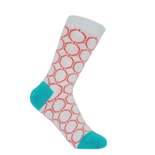 Introducing the Beehive Women's Socks in grey, a perfect blend of style and comfort. These socks are designed to make you stand out while providing the utmost comfort for your feet. The light grey color is beautifully complemented by a warm orange beehive pattern, and the aqua heel and toe add a refreshing touch. Whether you're dressing up for a special occasion or just lounging at home, these socks are the ideal accessory to elevate your outfit.
