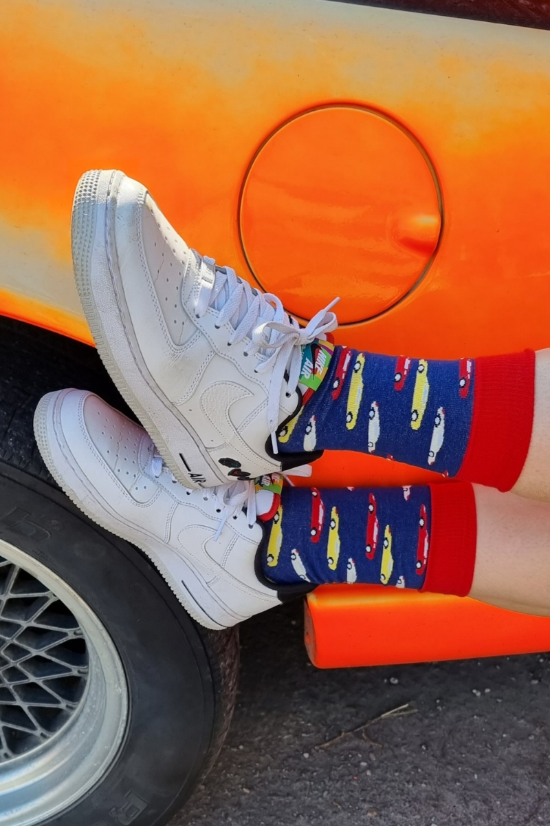 The CAR RENTAL blue socks are not just about comfort; they also feature a fun and unique design that showcases white, red, and yellow cars. This playful pattern is perfect for those who want to express their love for cars in a subtle yet stylish way. Whether you're pairing them with casual wear or using them to add a pop of color to your outfit, these socks are sure to turn heads.