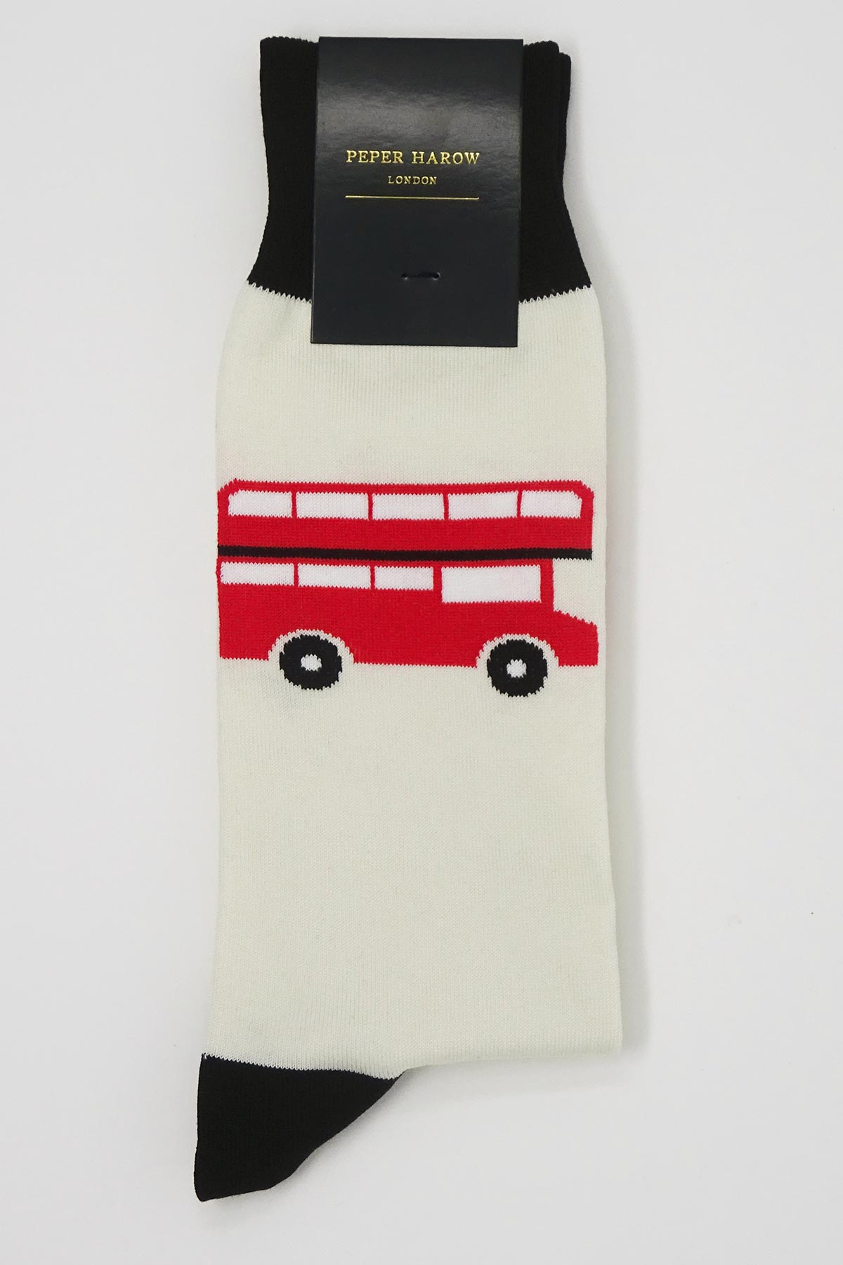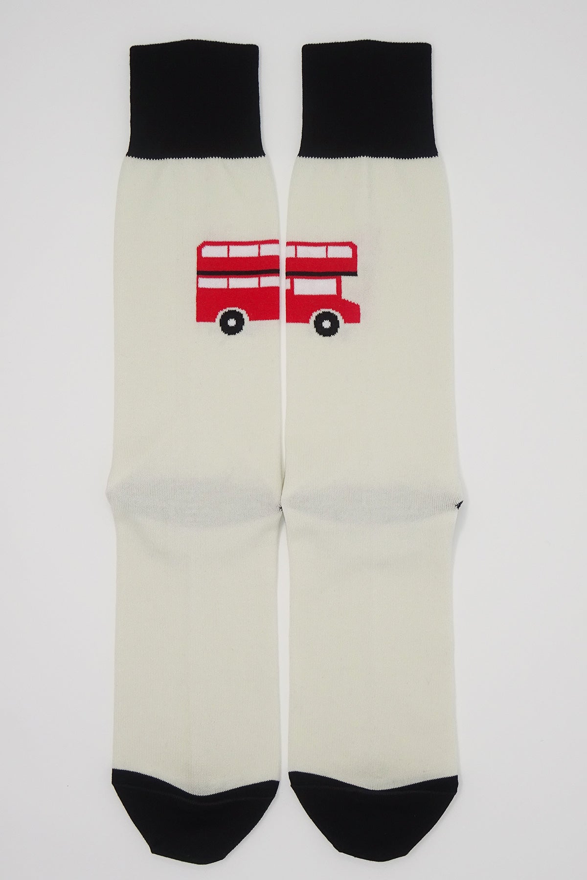 Cream men's socks featuring an iconic London red bus design, showcasing luxury and style.