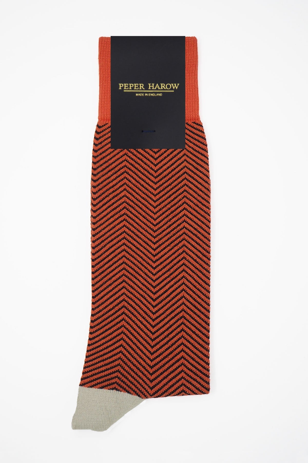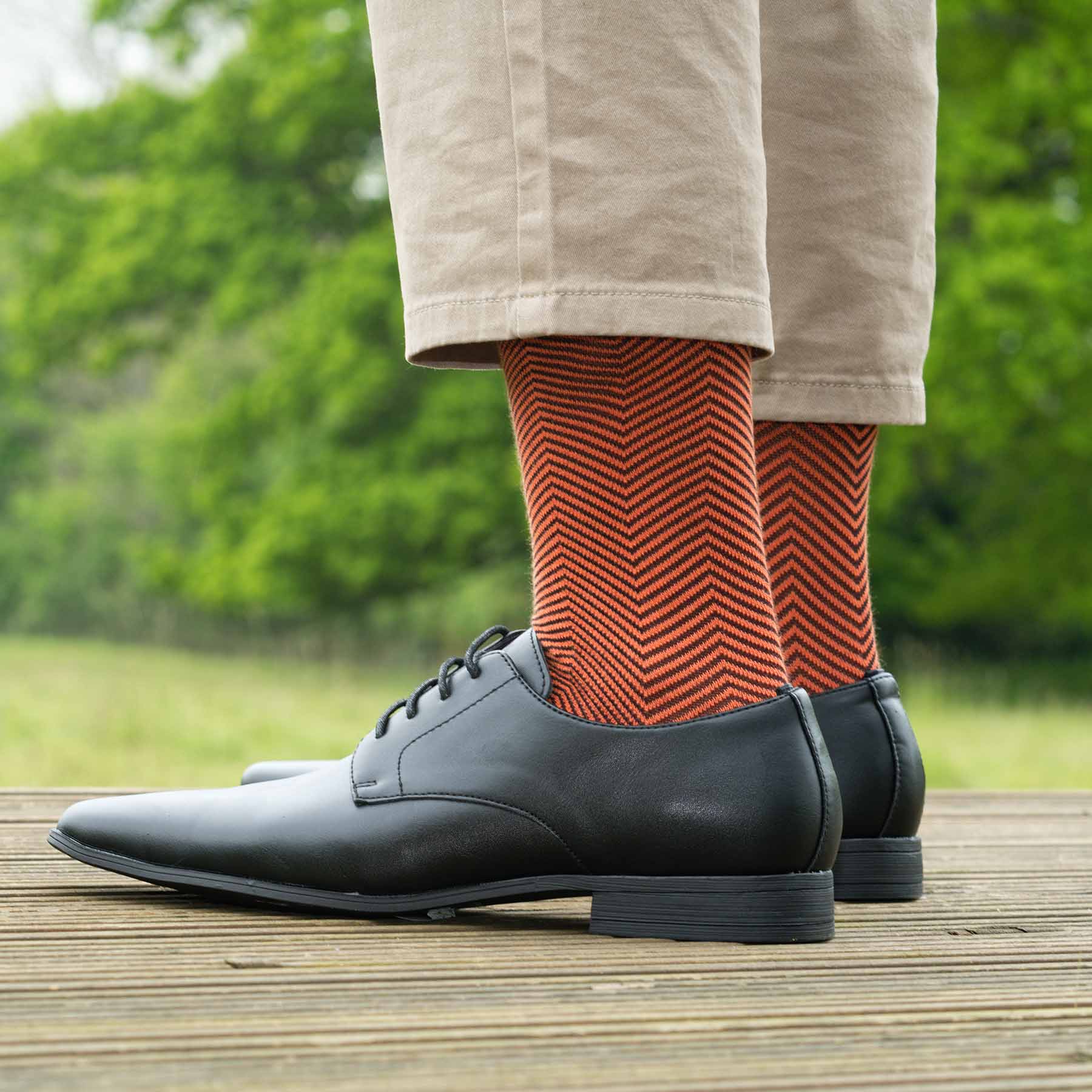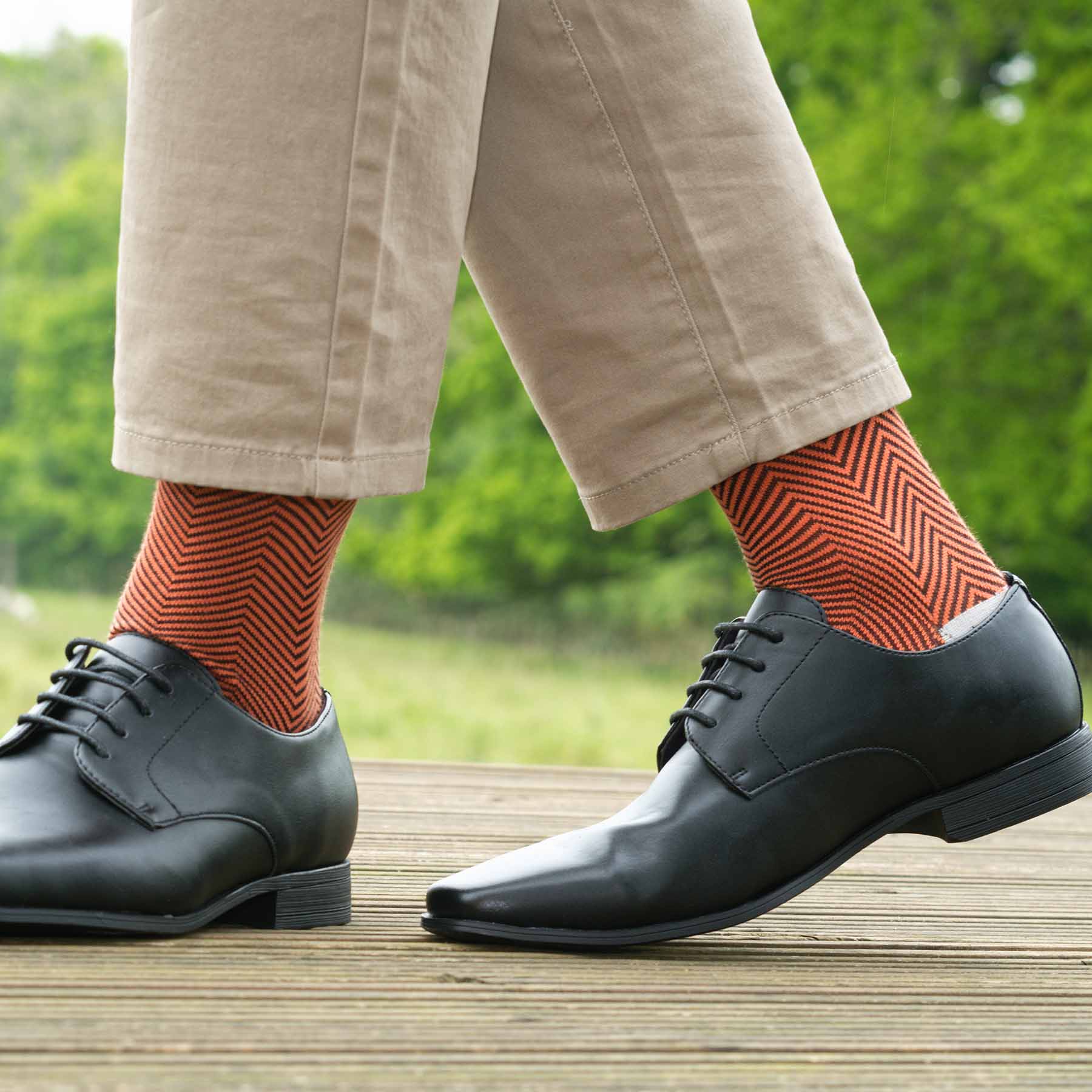 The unique black zigzag pattern against the vibrant orange background creates a modern and stylish look that can be paired with a variety of outfits. Whether you're dressing up for a formal occasion or looking to add a pop of color to your casual wear, these socks are versatile enough to fit any style. The cream heel and toe add a touch of elegance, making them suitable for both business and leisure settings.