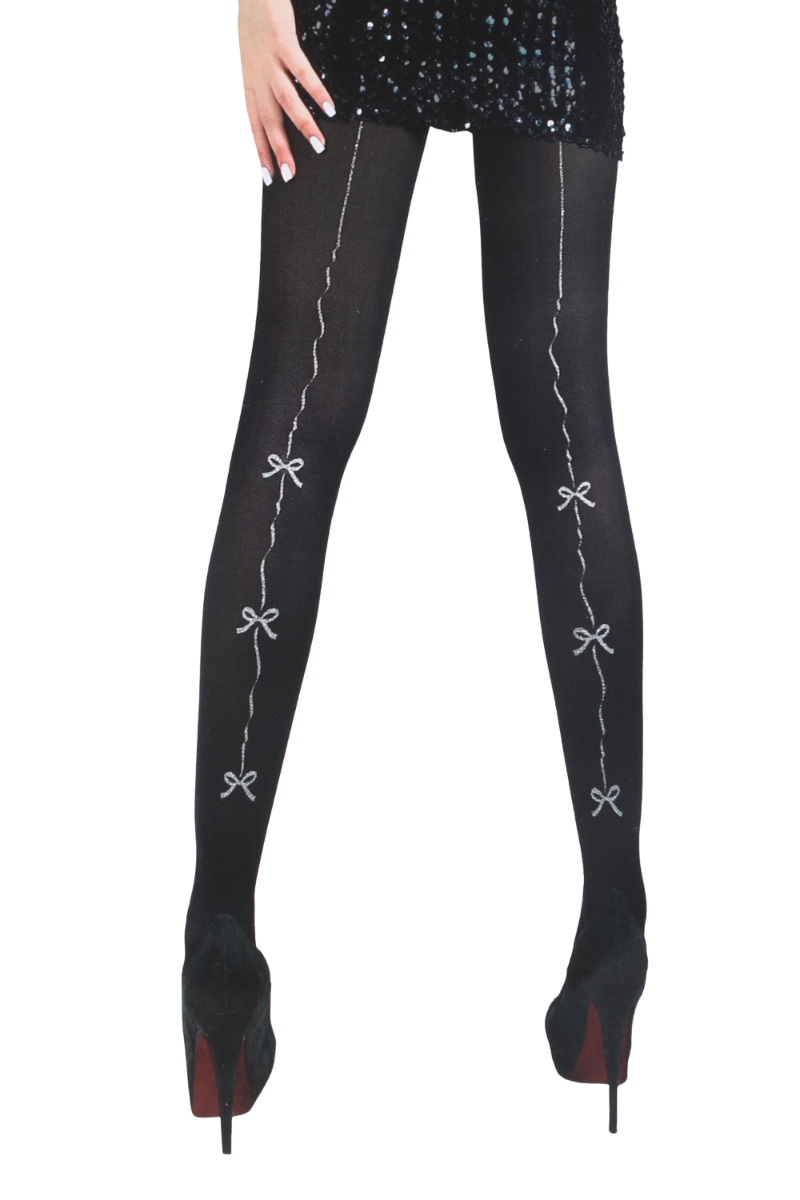 Introducing the RIBBON black tights with silver details, the perfect addition to any fashion-forward woman's wardrobe. These tights are designed not only for comfort but also to make a statement. The sleek black color provides a classic base, while the striking silver shiny stripe along the back of the leg adds a touch of glamour and sophistication. Whether you're dressing up for a night out or looking to elevate your everyday style, these tights are an excellent choice.