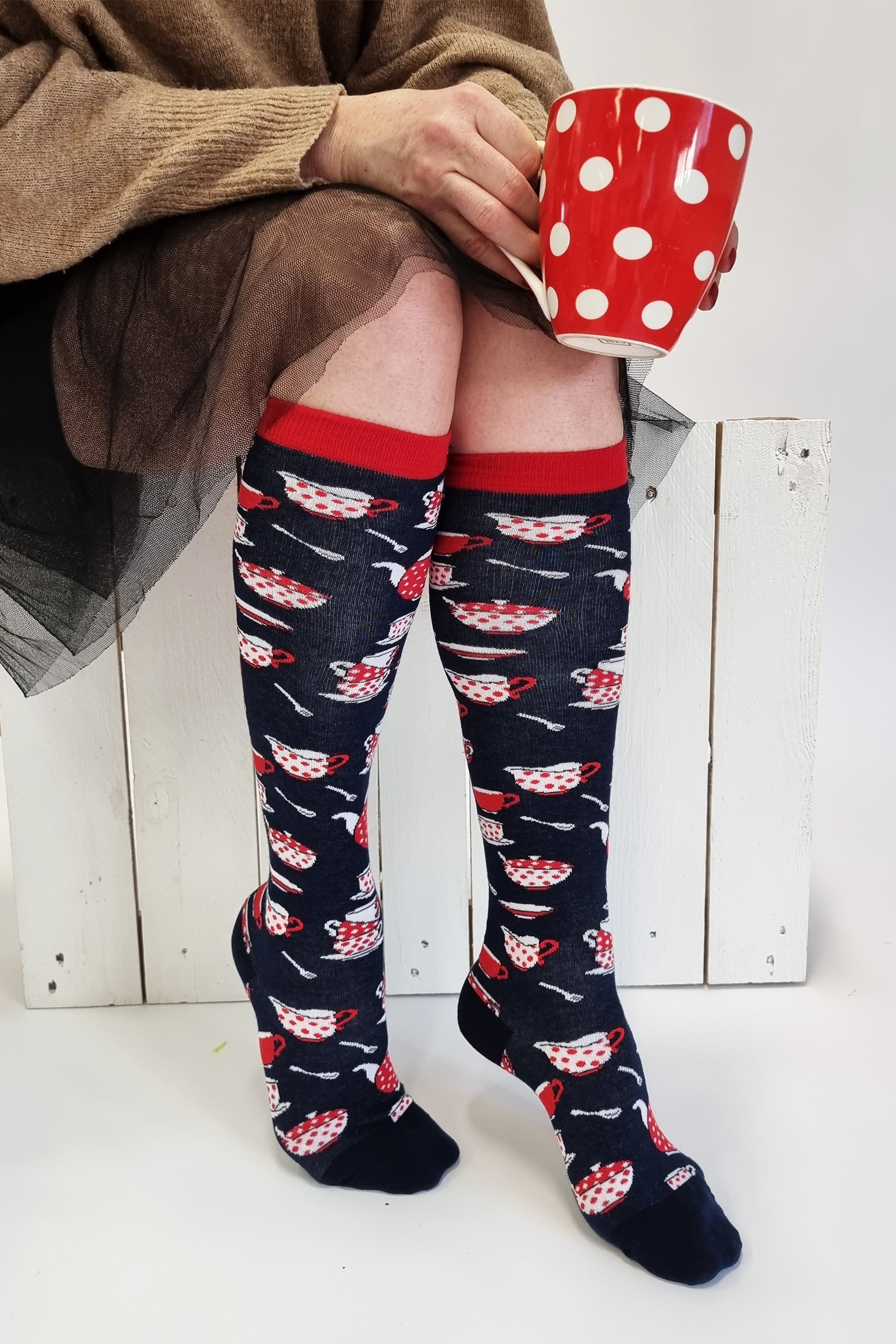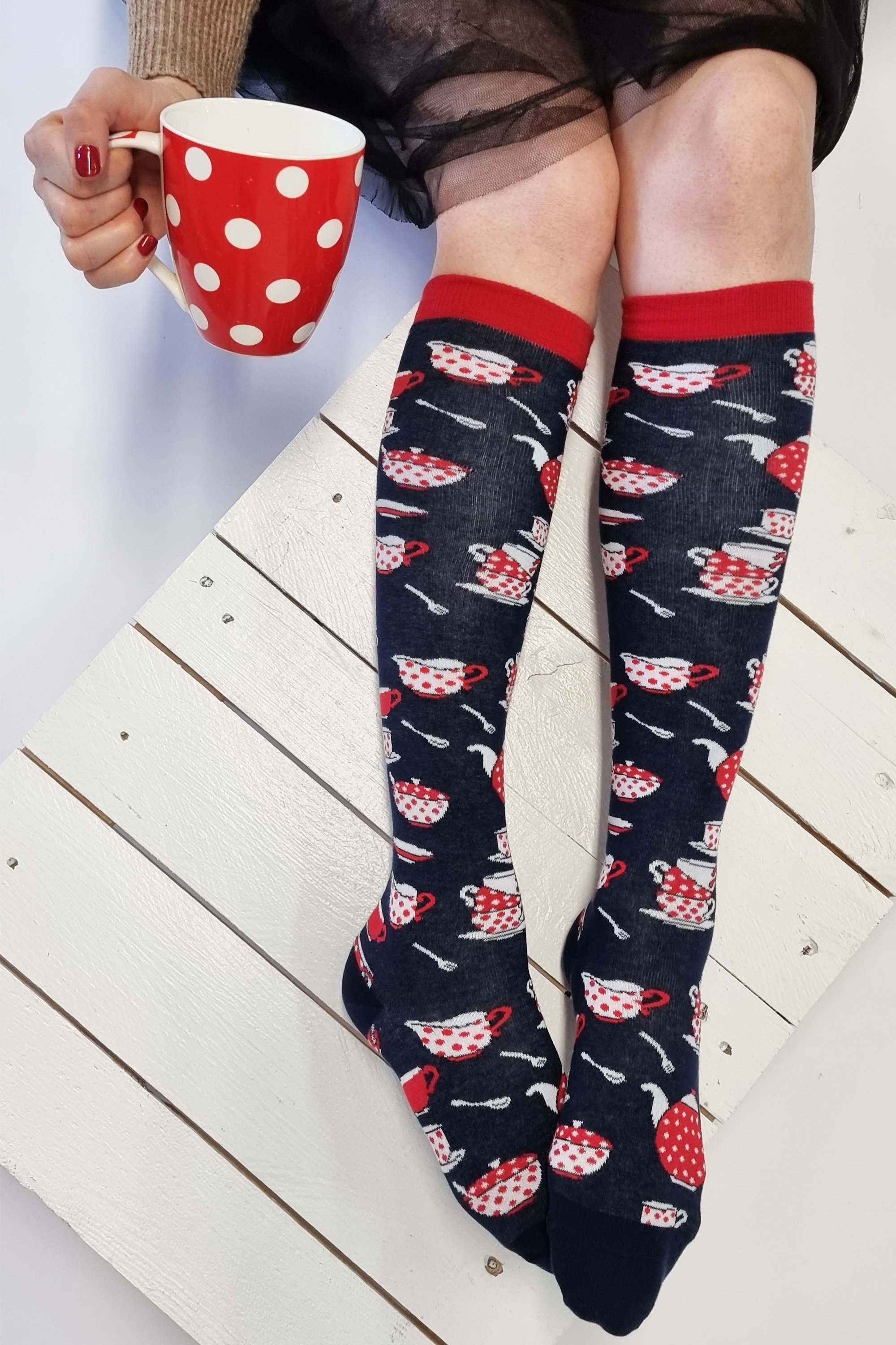 Dark blue knee-high socks featuring cute tea cup designs, perfect for tea lovers.