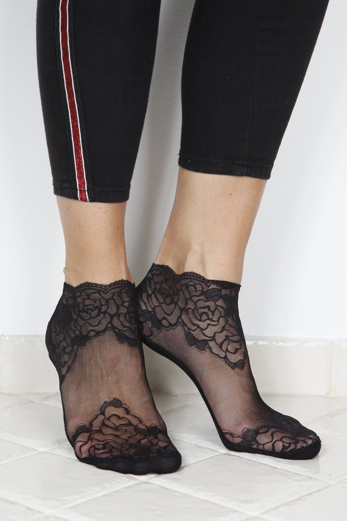 The TERESA black lace socks feature a delicate lace pattern that adds a feminine touch to any ensemble. The intricate lace detailing not only enhances the aesthetic appeal but also provides a unique texture that sets these socks apart from ordinary options. Whether paired with heels, flats, or even ankle boots, these socks will make a stylish statement.