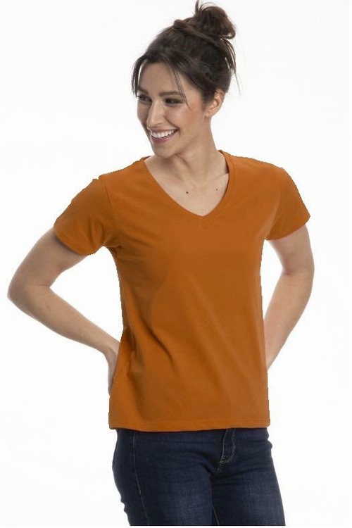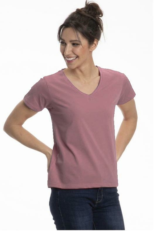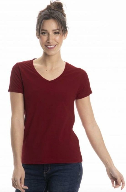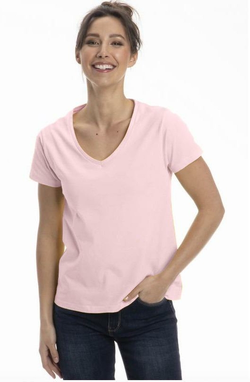 A collection of Women's Classic Cotton V-Neck T-Shirts in various colors, showcasing the soft fabric and stylish design.