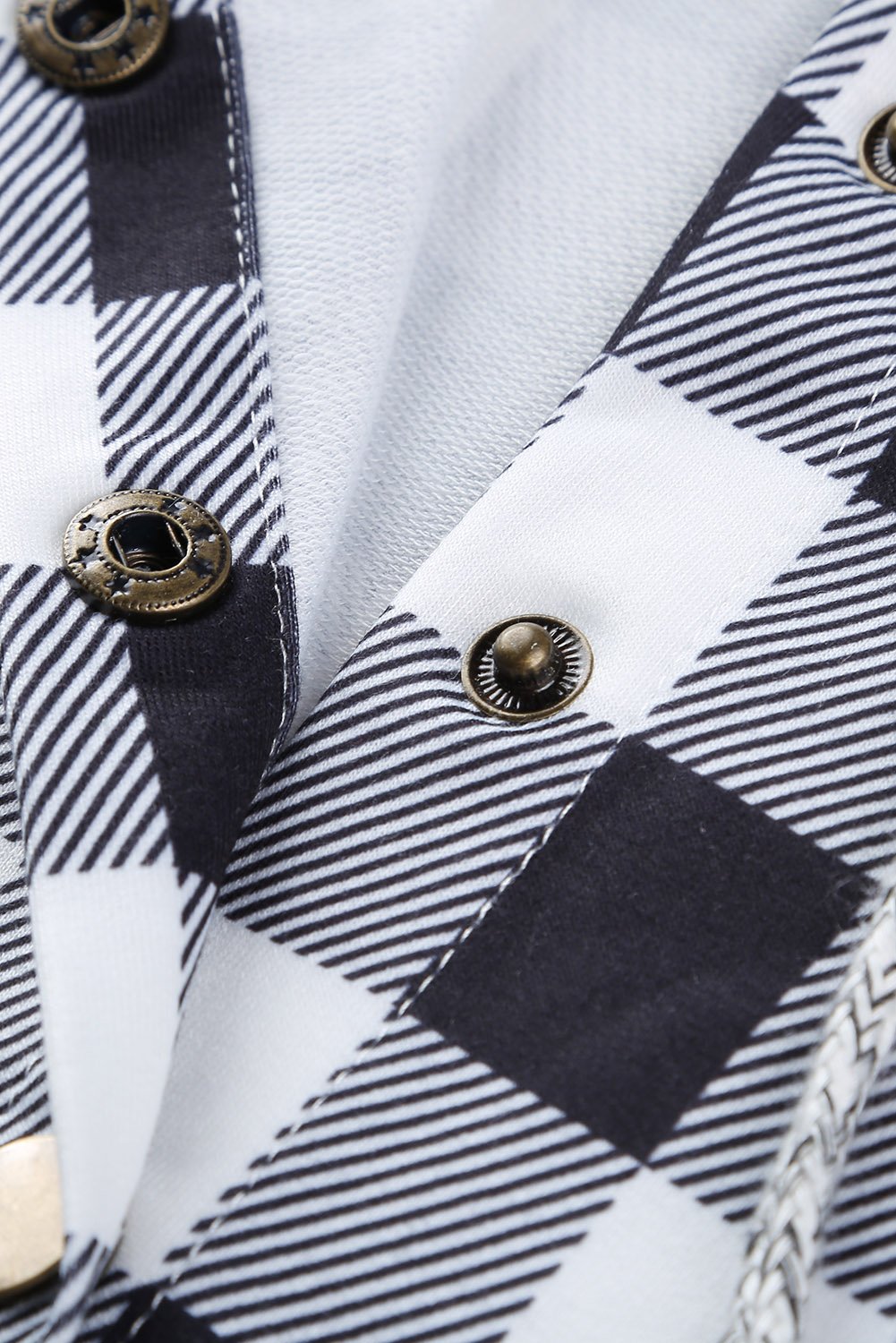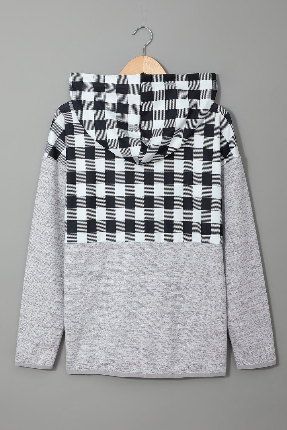 The Black Plaid Gray Hoodie features a trendy color block and plaid pattern that adds a touch of flair to your outfit. The upper part of the hoodie is adorned with different color plaids, creating a unique and eye-catching look. The buttoned half open neckline and pullover hooded style provide versatility, allowing you to adjust the fit according to your preference.