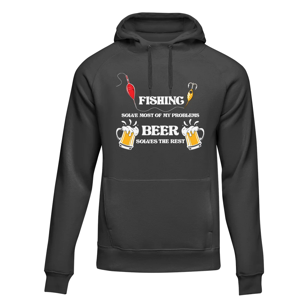A stylish unisex hoodie featuring the phrase 'Fishing Solves All My Problems', perfect for fishing enthusiasts.
