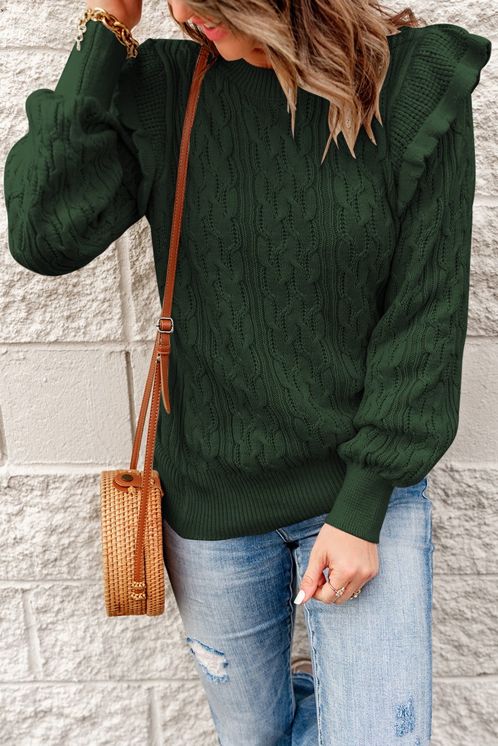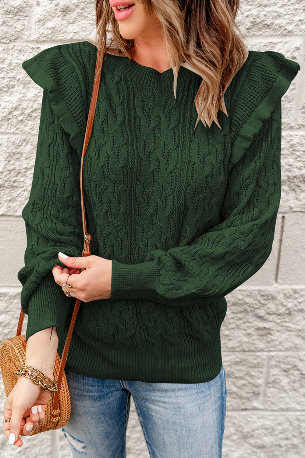 A stylish green cable knit sweater with feminine ruffles on the shoulders, showcasing ribbed details at the neckline, cuffs, and hemline.