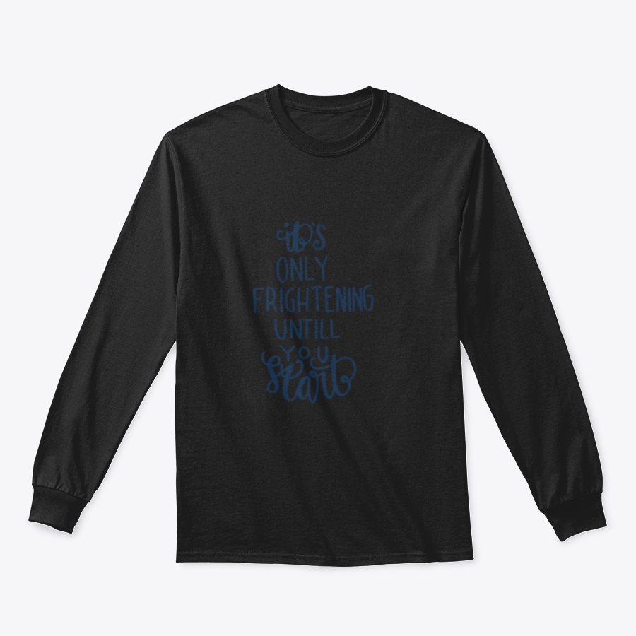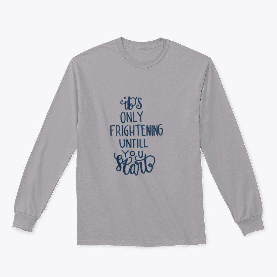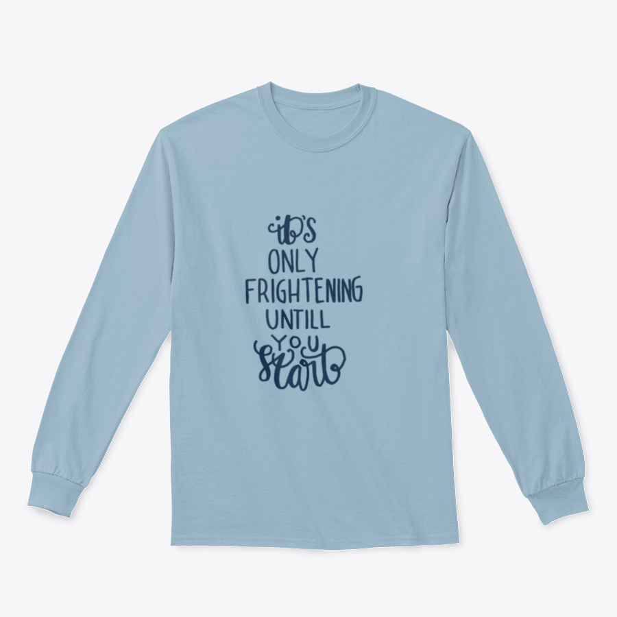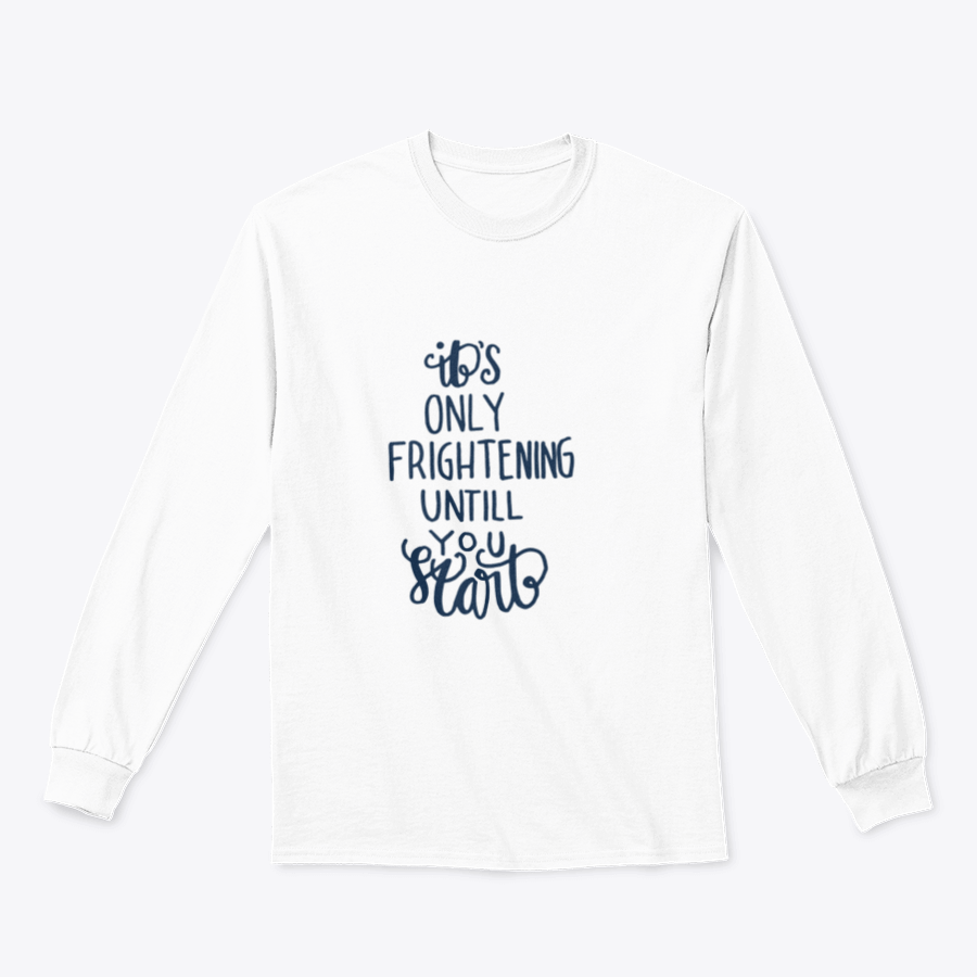 Introducing the 'It's Only Frightening Until You Start' hand lettered quote, a unique piece that combines art and motivation. This modern design serves as a daily reminder to embrace challenges and take the first step towards your goals. Crafted with care, this product is perfect for anyone looking to add a touch of inspiration to their wardrobe or home decor.