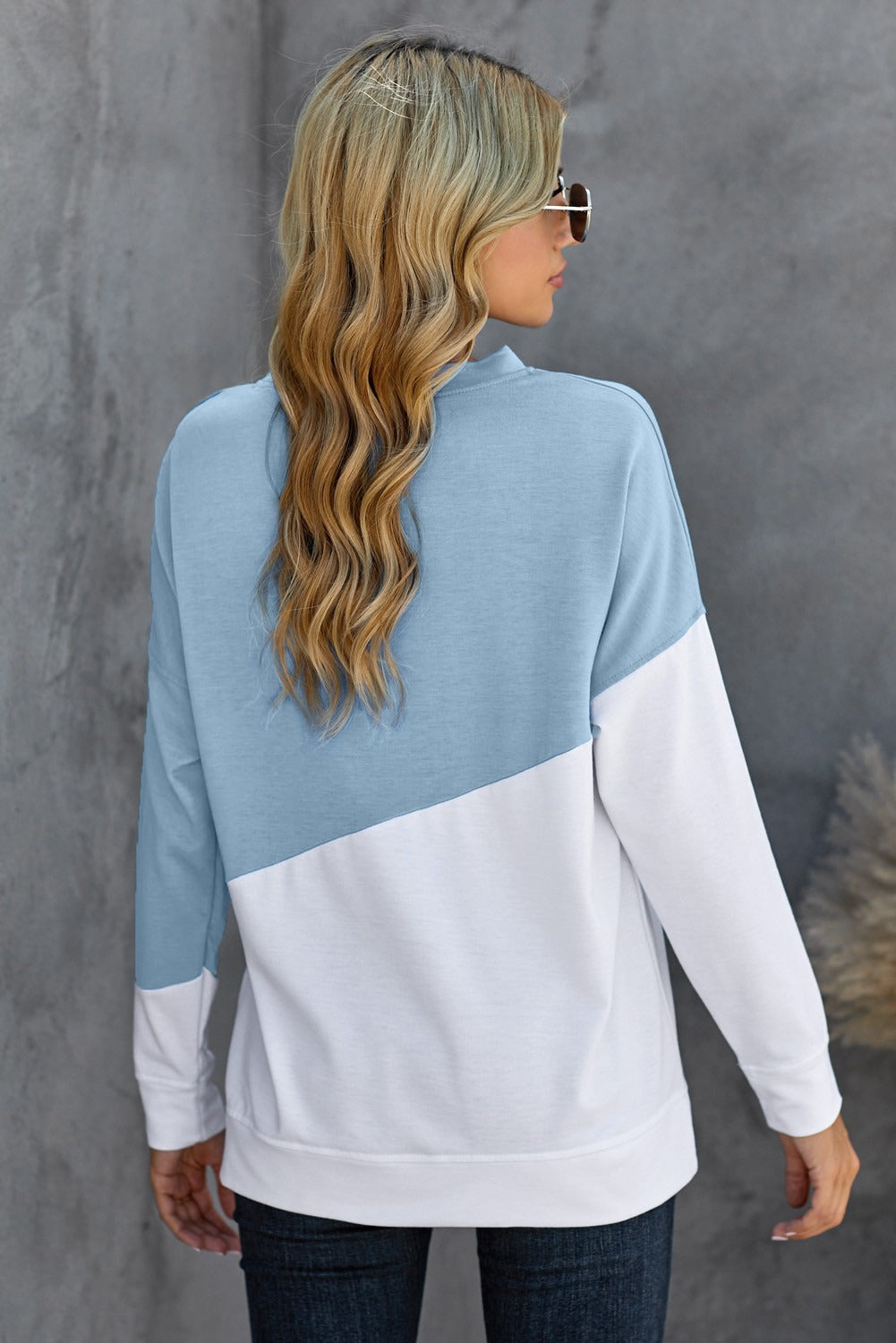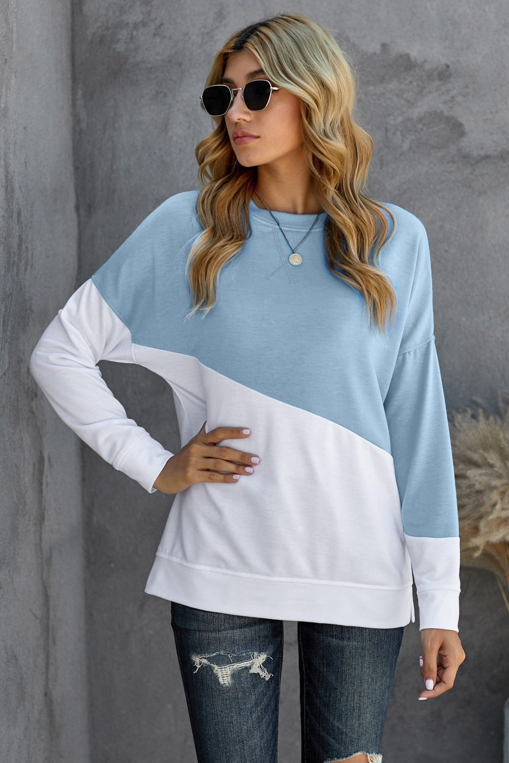 In summary, the Light Blue White Patchwork Dropped Shoulder Sweatshirt is a stylish and comfortable choice for anyone looking to enhance their casual wardrobe. With its trendy design, soft fabric, and versatile styling options, it is sure to become a favorite piece in your collection.