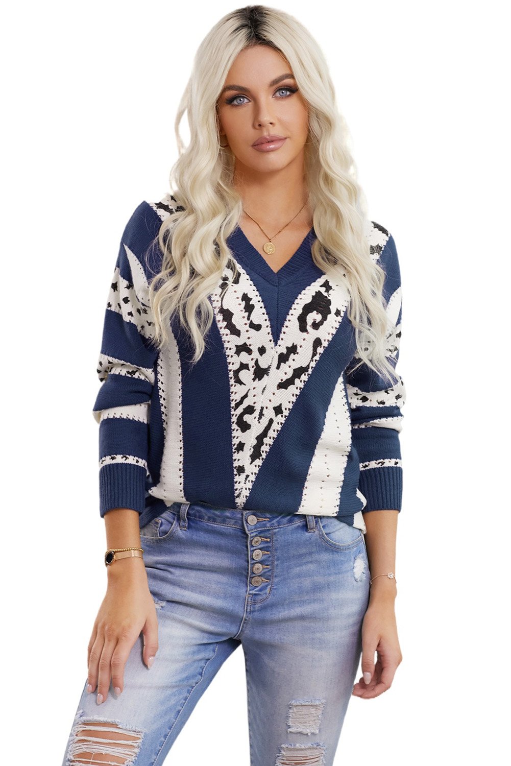 Introducing the Women's Fashion Blue Animal Print Accent V Neck Sweater, a must-have addition to your wardrobe that combines style and comfort effortlessly. This sweater features a chic animal print design that adds a trendy touch to your casual outfits. Whether you're heading out for a coffee date or a casual day at the office, this sweater will elevate your look instantly.