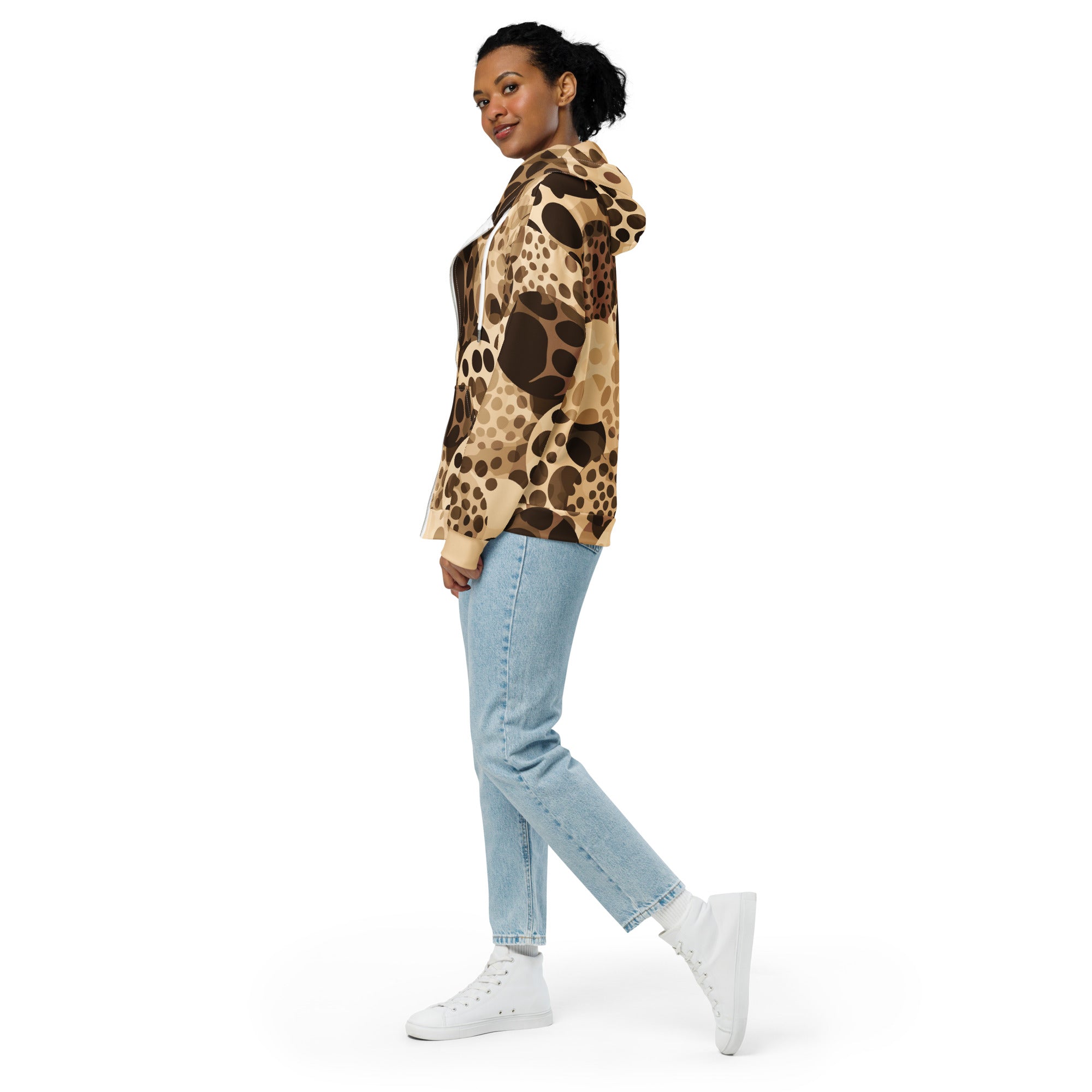 Introducing our Women's Graphic Zip Hoodie in a stunning beige and brown spotted print, a perfect blend of style and sustainability. This hoodie is designed for those who appreciate comfort without compromising on fashion. Made from a high-quality fabric blend of 95% polyester and 5% spandex, it offers a soft, cotton-like feel on the outside while featuring a cozy brushed fleece lining on the inside. Whether you're lounging at home or heading out for a casual day, this hoodie is your go-to choice.