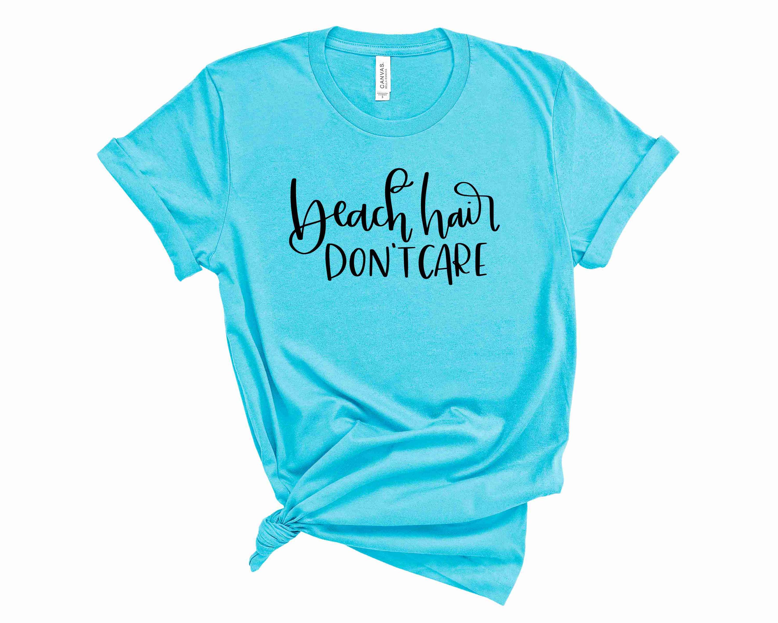 The standout feature of this t-shirt is its eye-catching graphic print. The phrase 'Beach Hair Don't Care' is boldly displayed, capturing the essence of a carefree beach lifestyle. This fun and trendy design makes it a great conversation starter and a perfect gift for beach lovers.