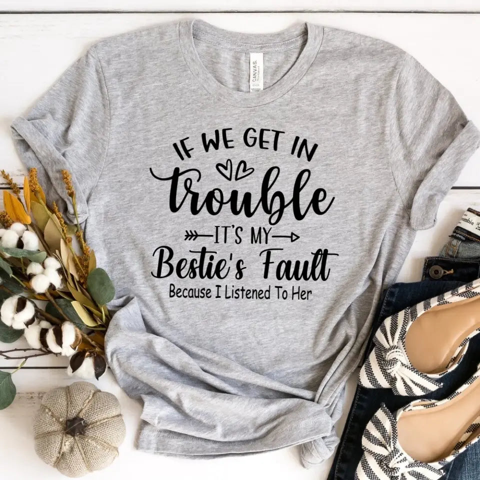 With its unique design and comfortable fit, you can expect a flood of compliments every time you wear the Bestie's Fault Tee. It's not just a t-shirt; it's a way to express your personality and style while enjoying the comfort of high-quality fabric.