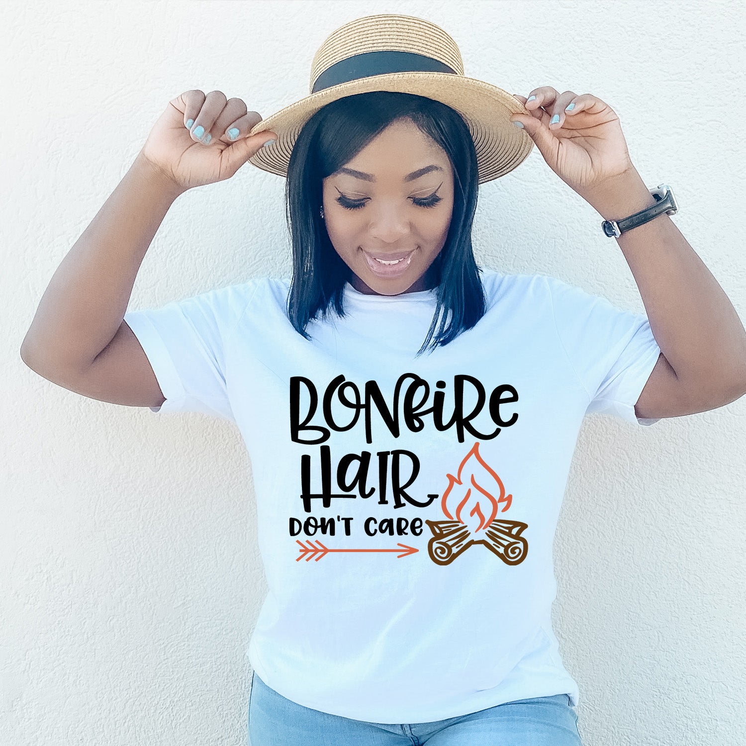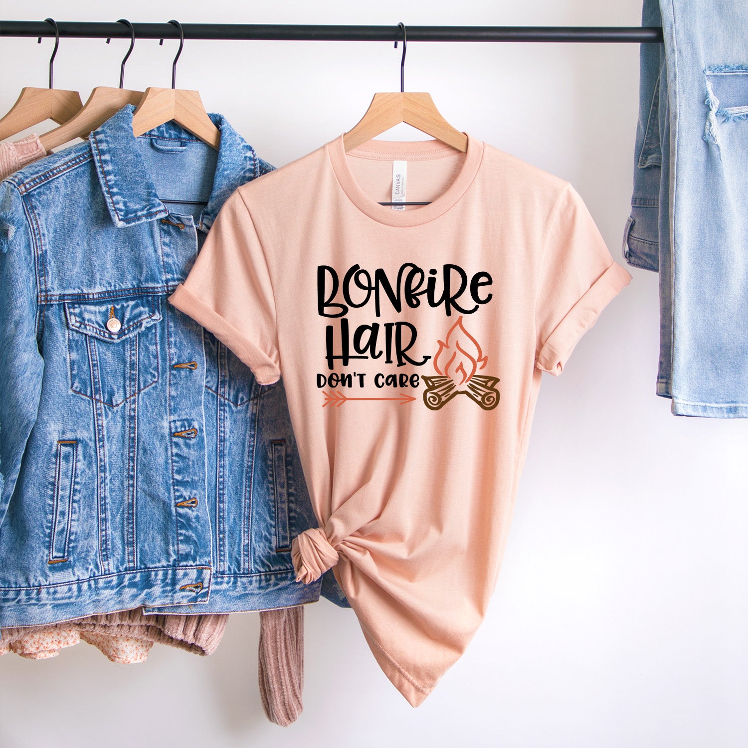 The Bonfire Hair Don't Care T-shirt also makes for an excellent gift for friends and family who appreciate fun and casual fashion. Whether it’s for a birthday, holiday, or just because, this shirt is sure to bring a smile to anyone's face. Its playful design and comfortable fit make it a thoughtful present that will be cherished and worn often.