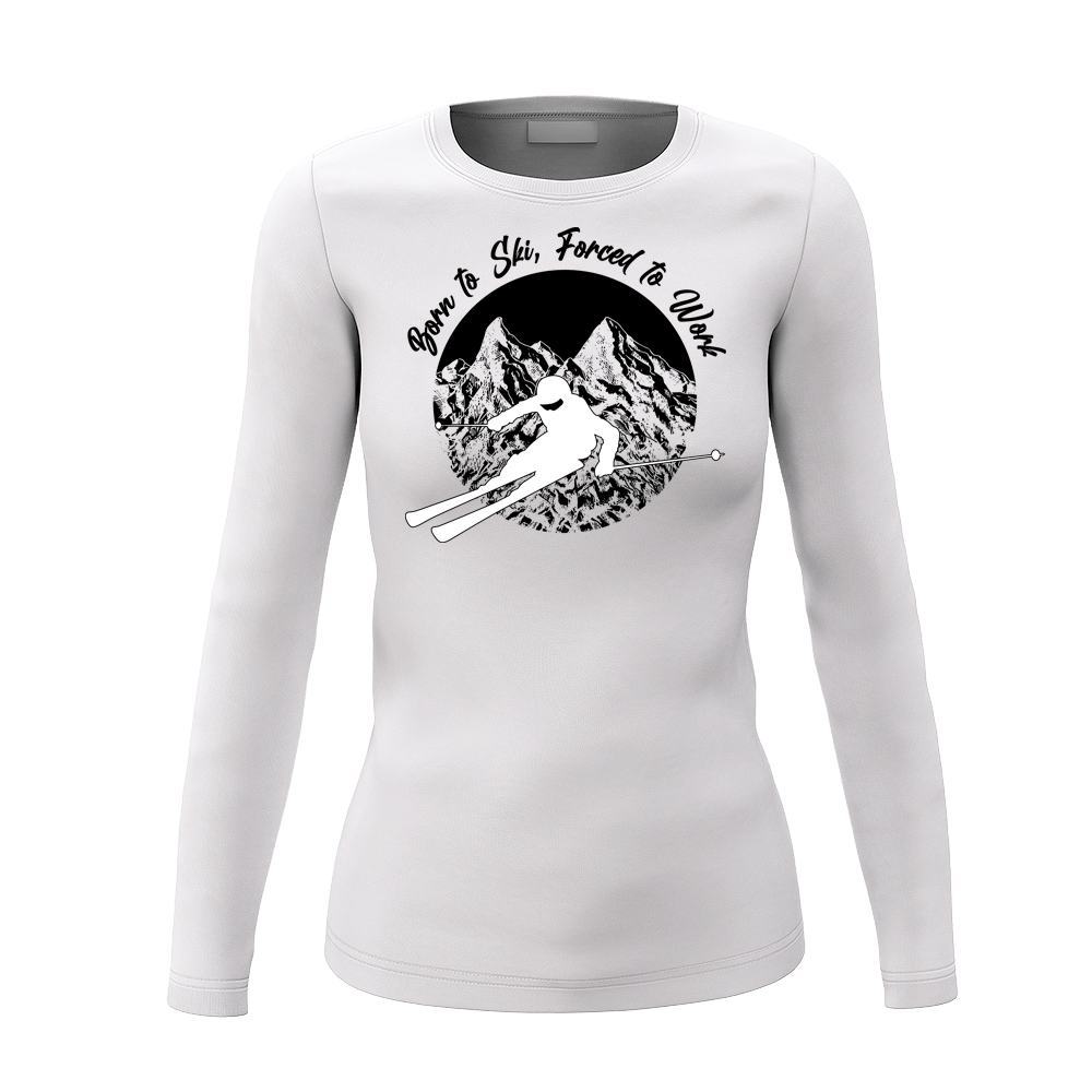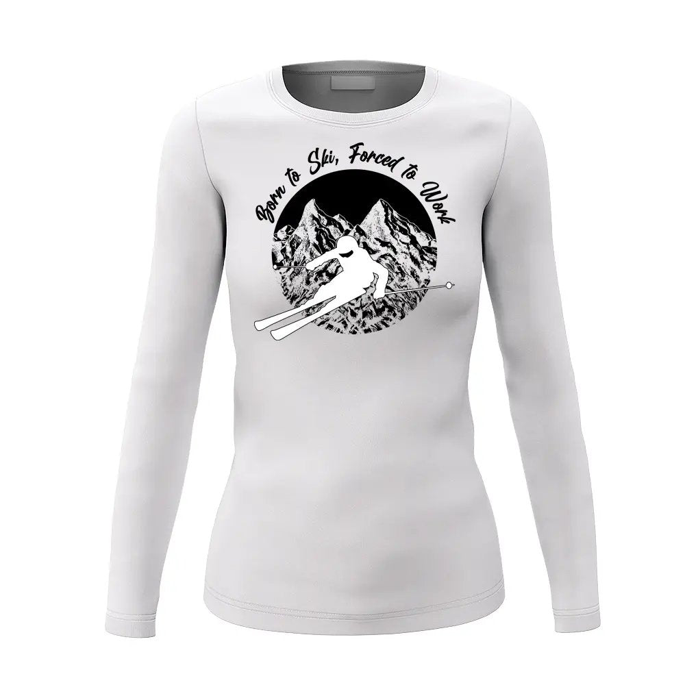 In summary, the Born To Ski Forced To Work Women Long Sleeve Shirt is more than just a piece of clothing; it's a celebration of your love for skiing. With its comfortable fit, durable construction, and unique design, it's the perfect addition to any ski enthusiast's wardrobe. Don't miss out on the opportunity to express your passion and receive compliments wherever you go!