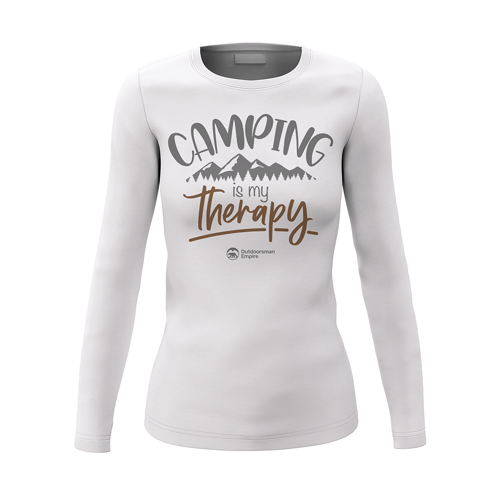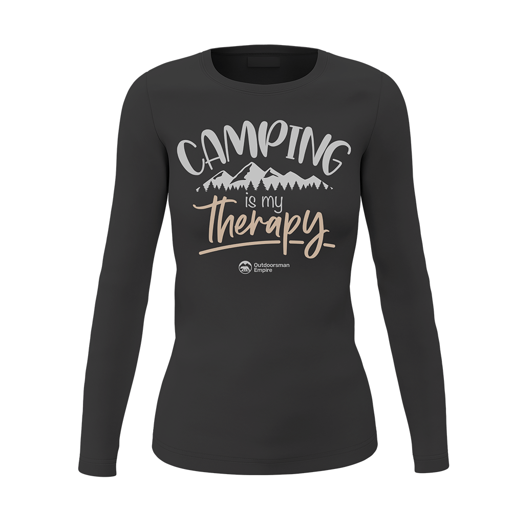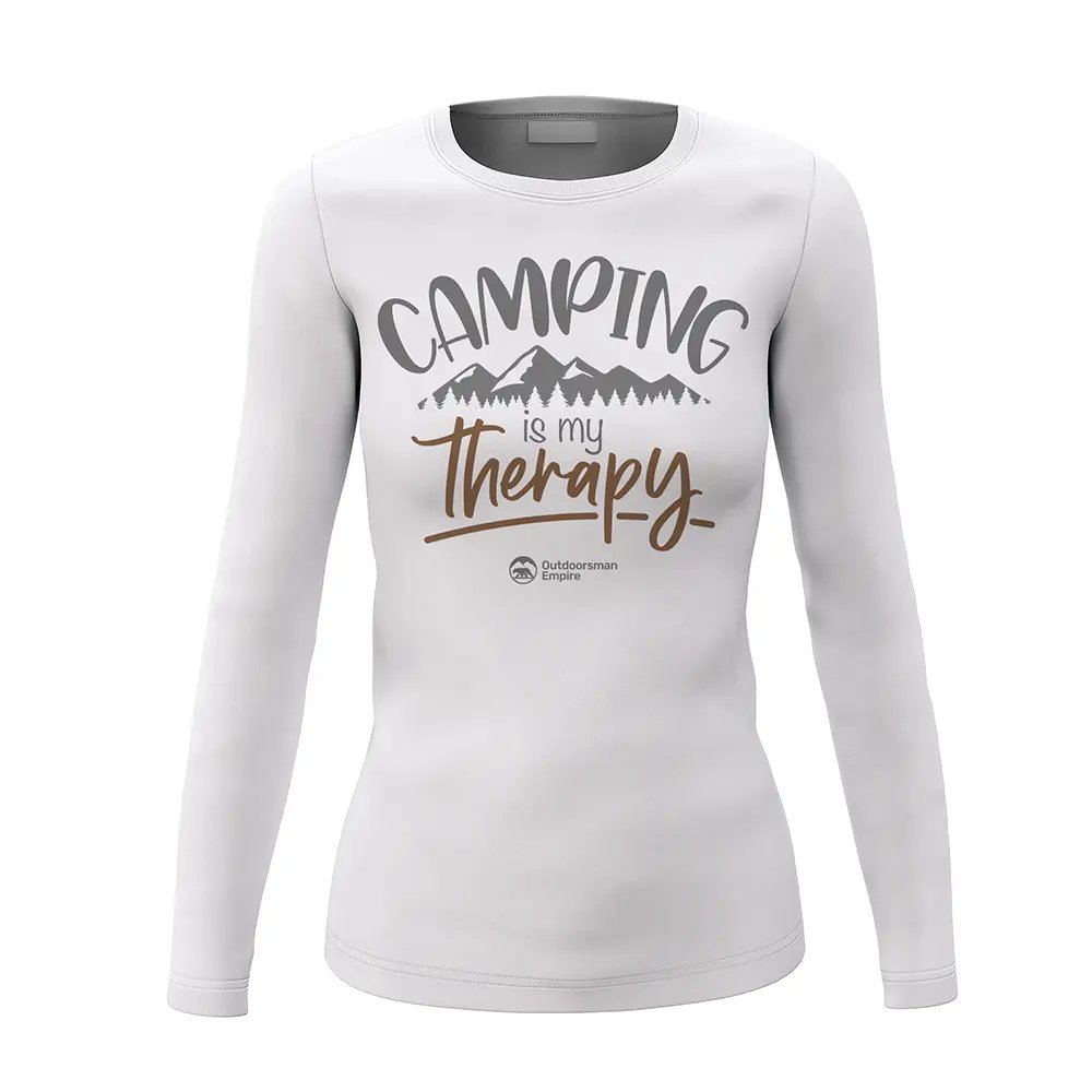 A stylish long sleeve shirt for women featuring the phrase 'Camping Is My Therapy', perfect for outdoor enthusiasts.