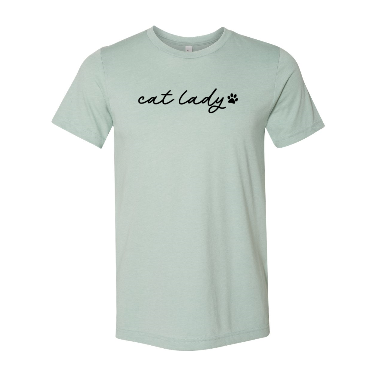 A stylish unisex Cat Lady Shirt made from soft ring spun cotton, featuring a classic crew neck and short sleeves, available in multiple colors.