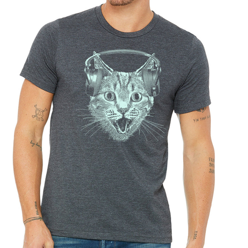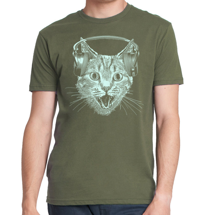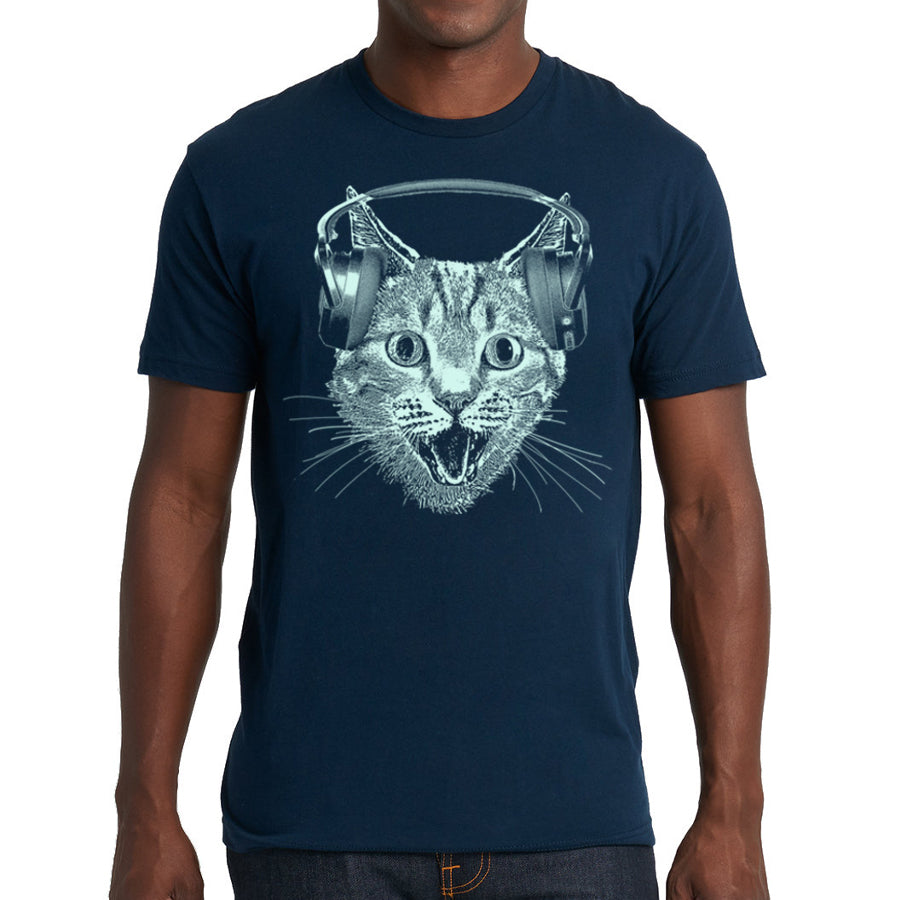 Men's T-shirt featuring a playful cat wearing headphones, perfect for music lovers and cat enthusiasts.