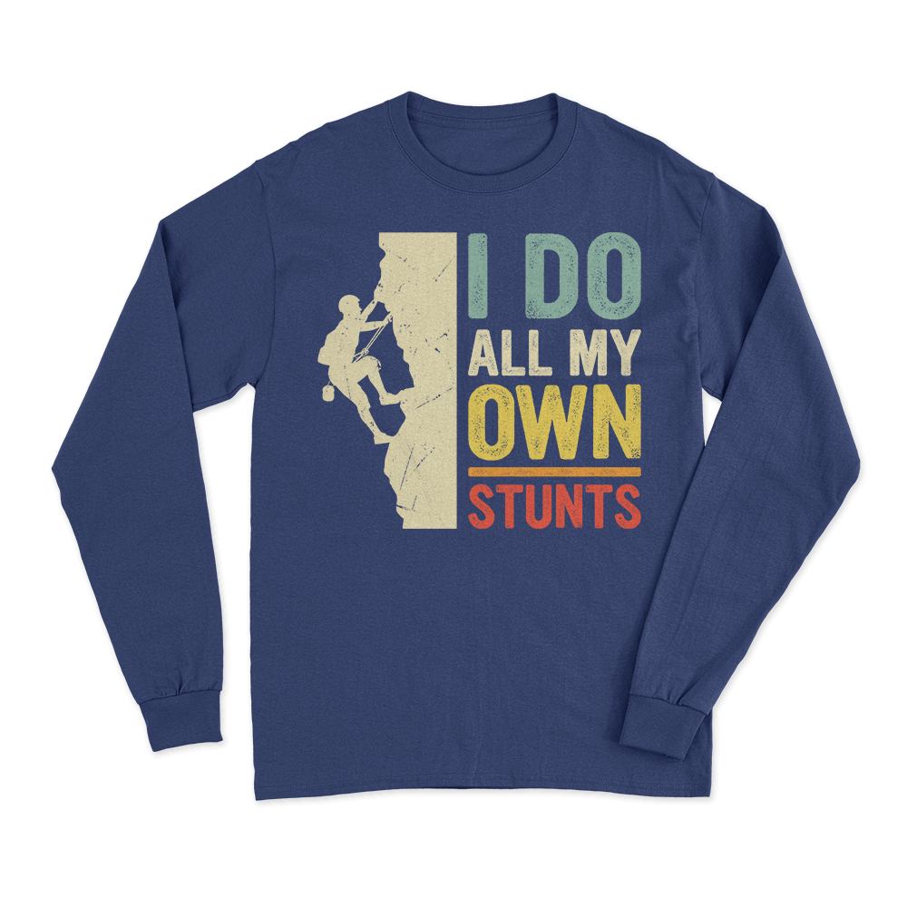 The Climbing I Do All My Own Stunts Men Long Sleeve Shirt is not just a piece of clothing; it's a statement. Designed for those who embrace adventure and love to stand out, this shirt is perfect for casual outings, outdoor activities, or simply lounging around. With its unique design, you are sure to receive compliments and spark conversations wherever you go.
