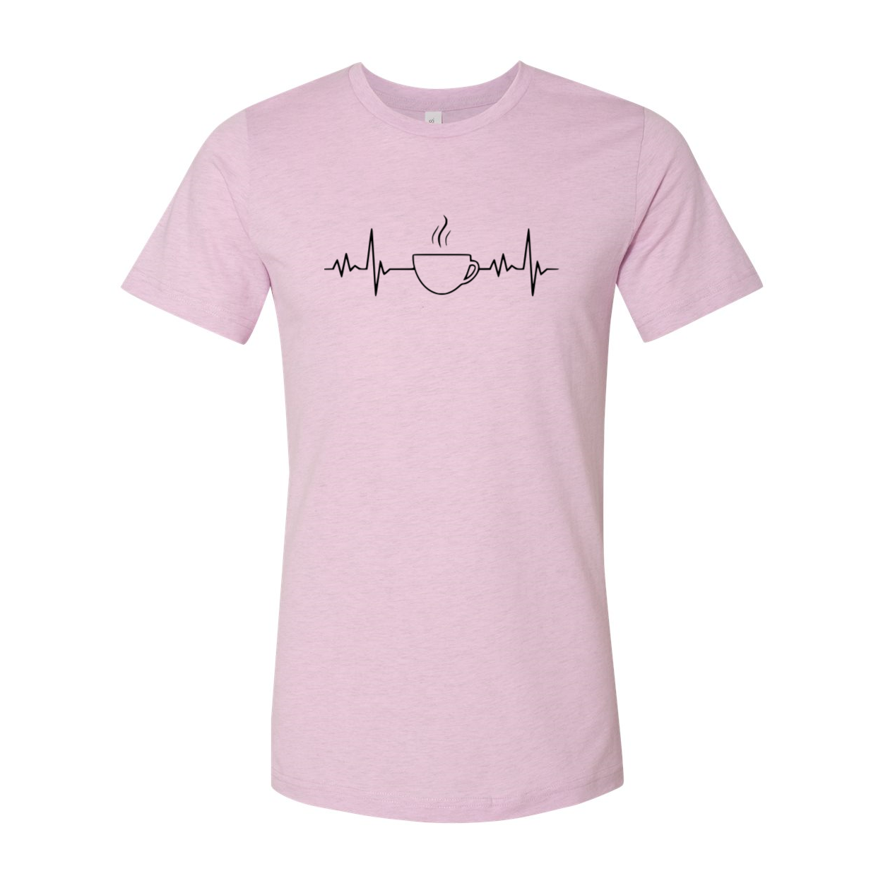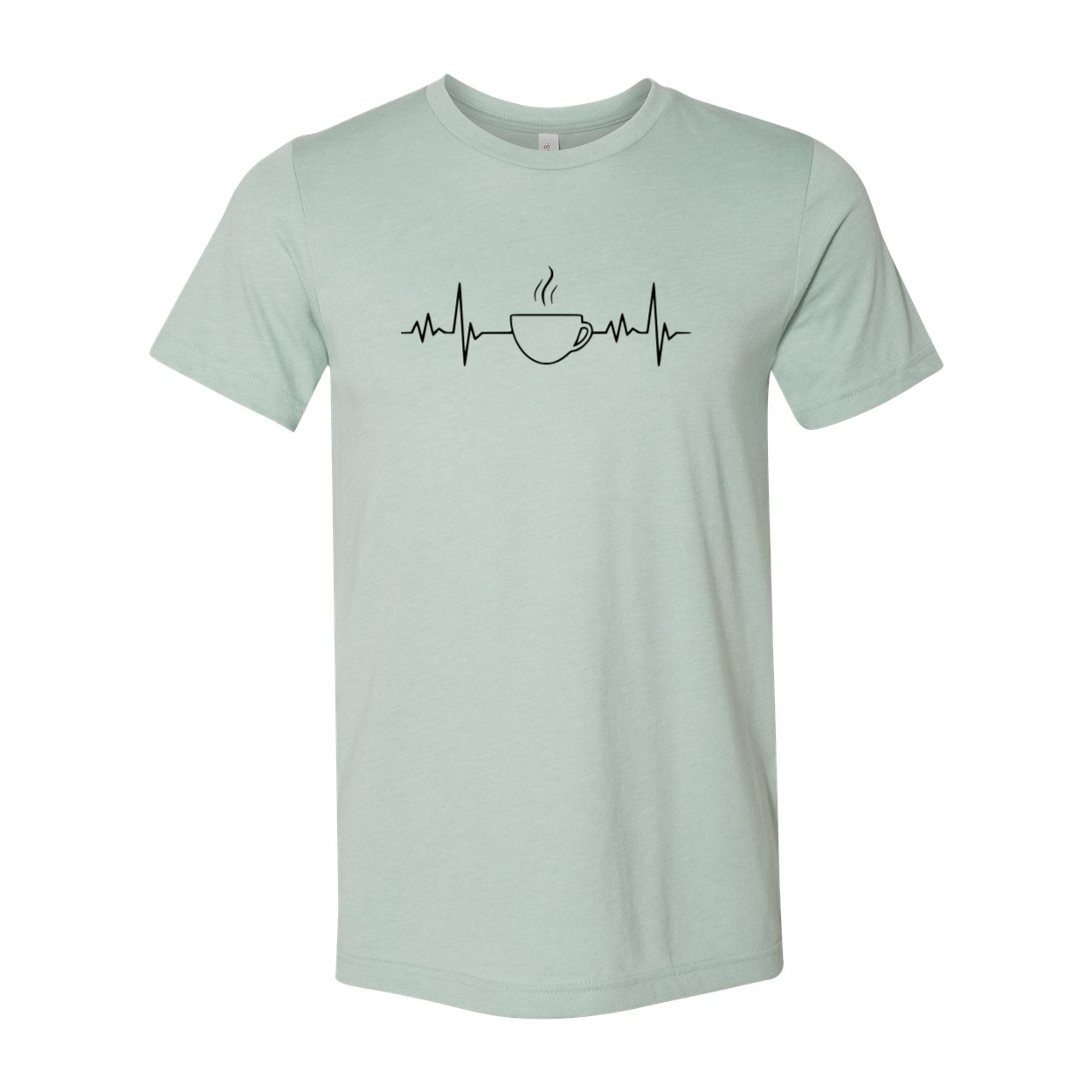 A stylish unisex Coffee Heartbeat Shirt made from soft ring spun cotton, featuring a vibrant coffee-themed print.