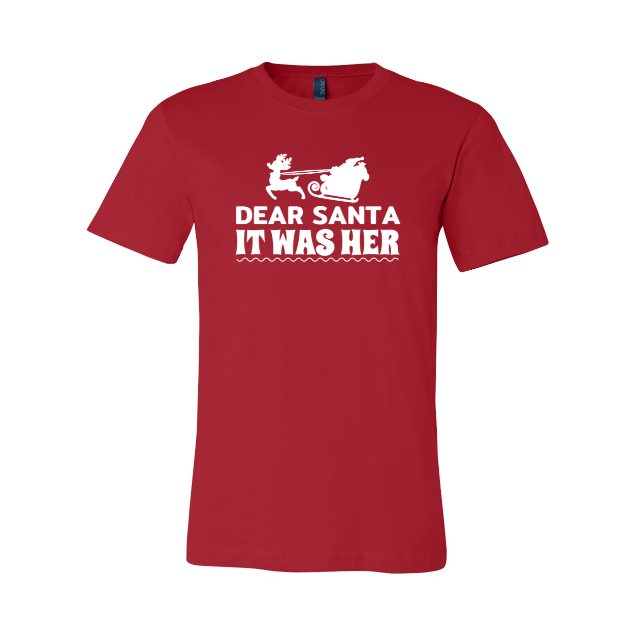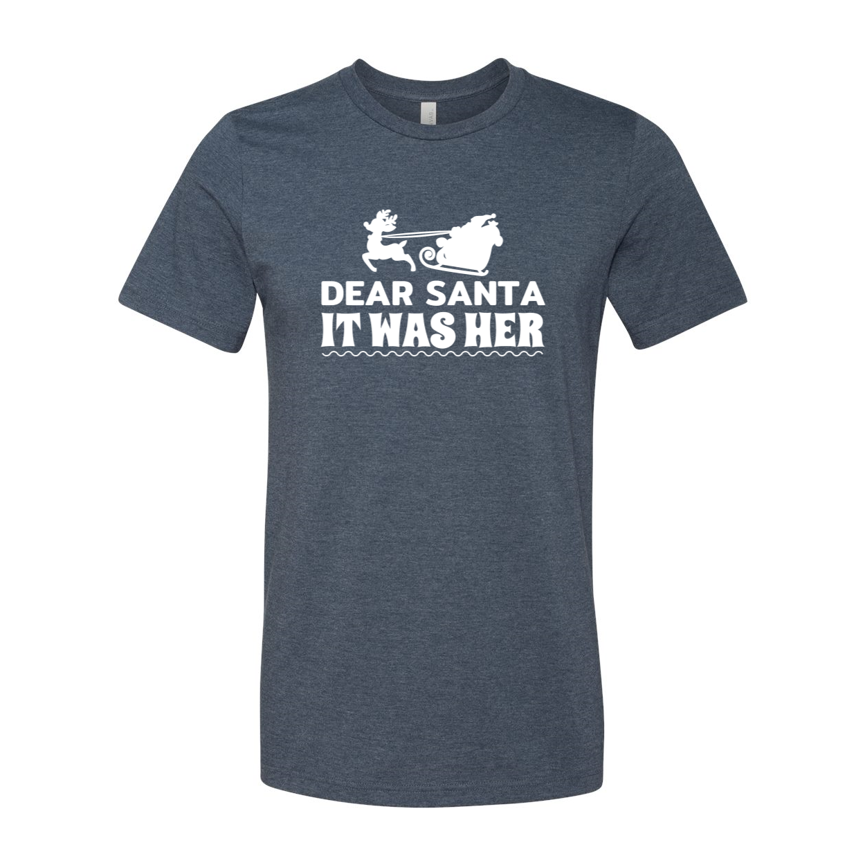 A unisex T-shirt featuring the phrase 'Dear Santa It Was Her Fault' in a playful font, made from soft ring spun cotton, available in various colors.