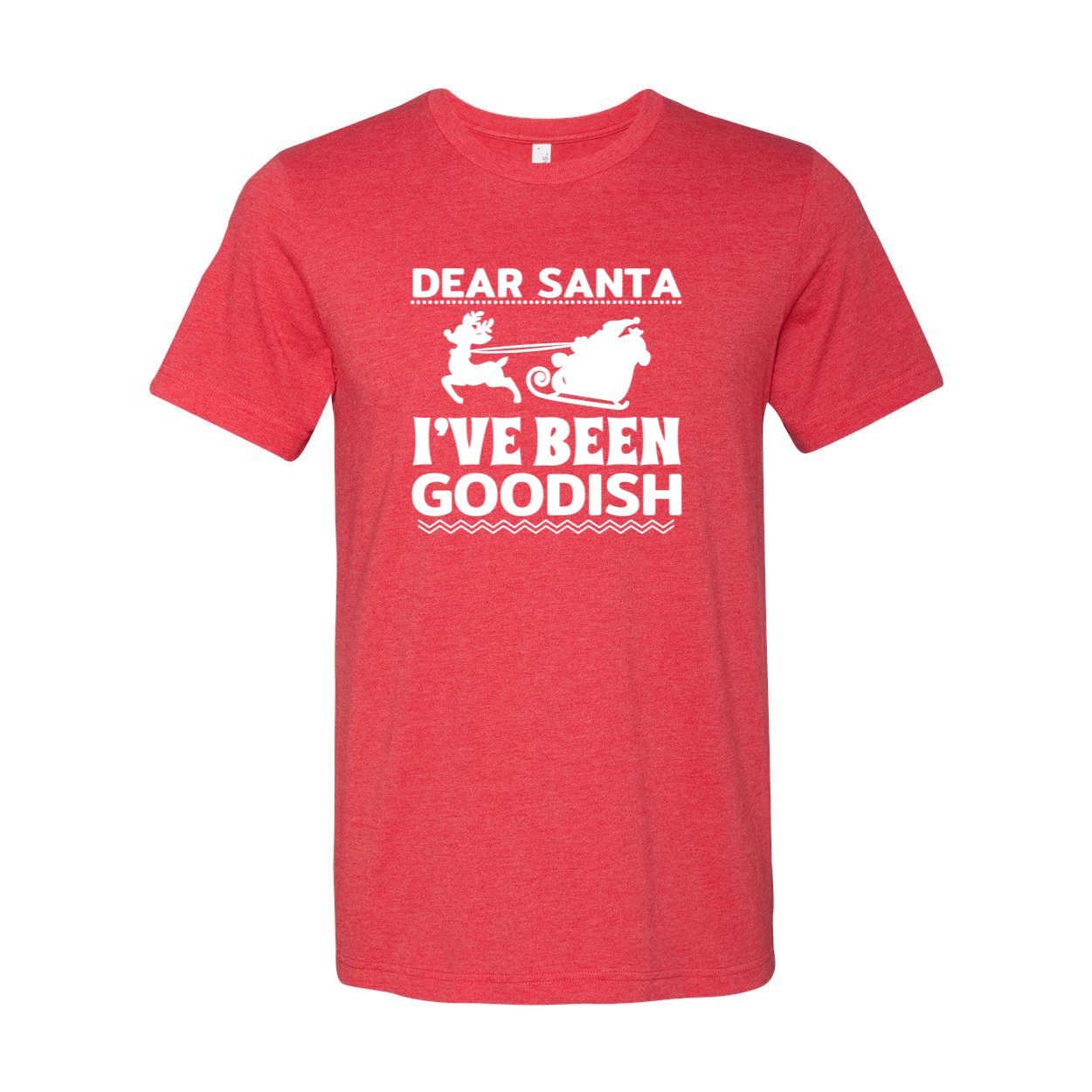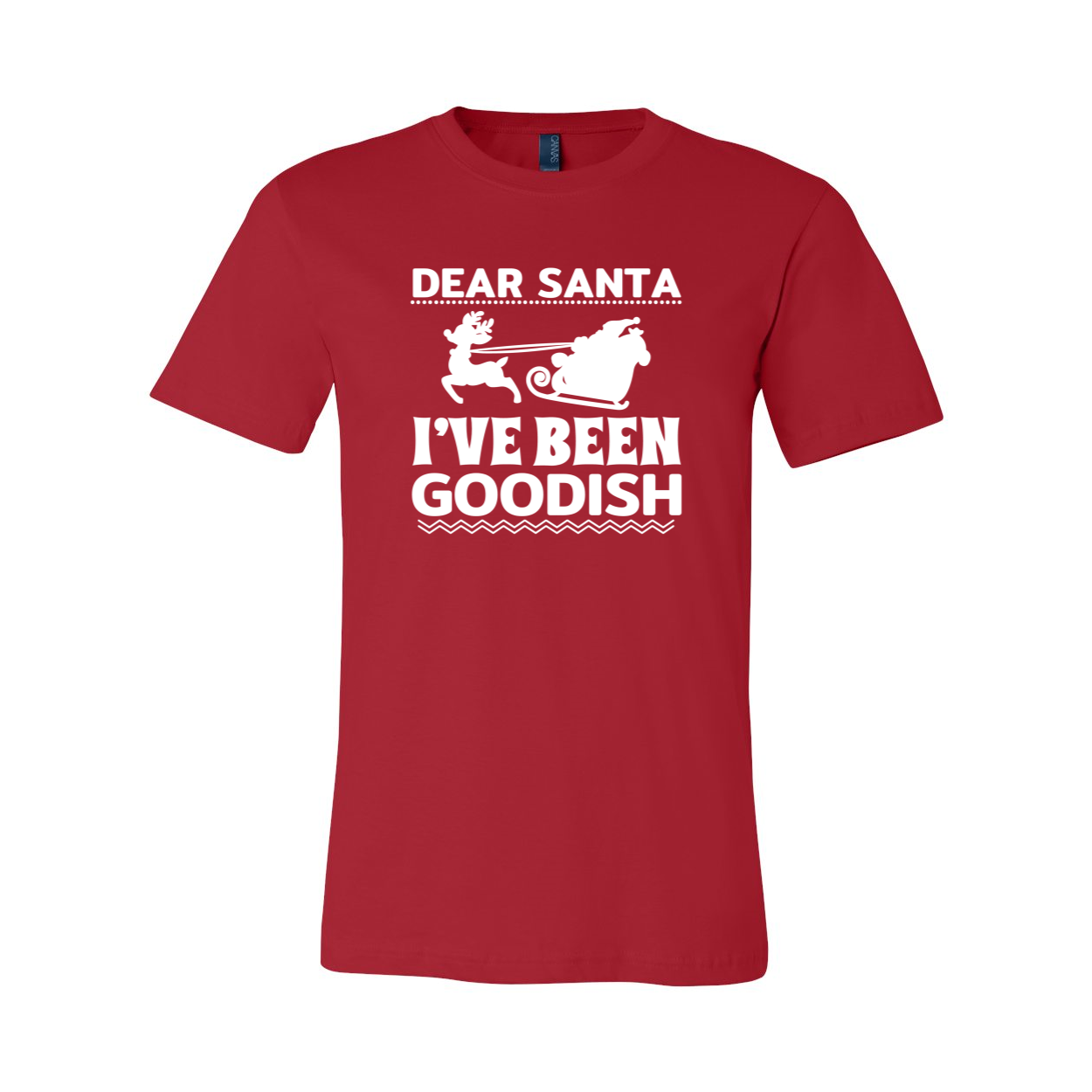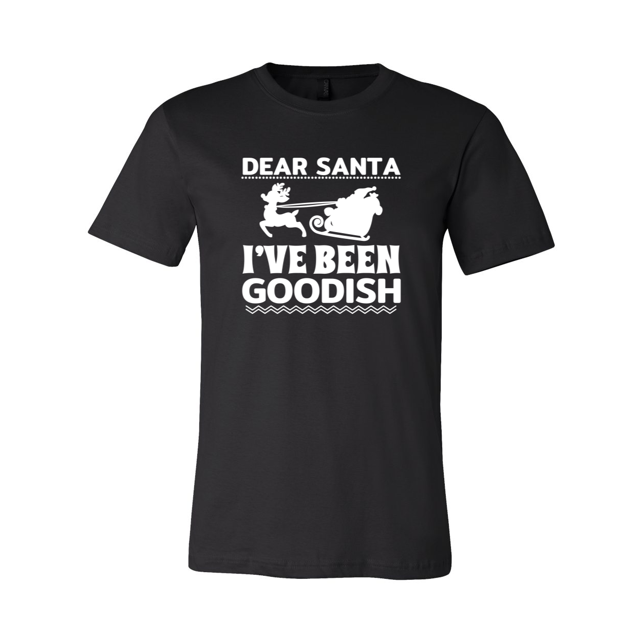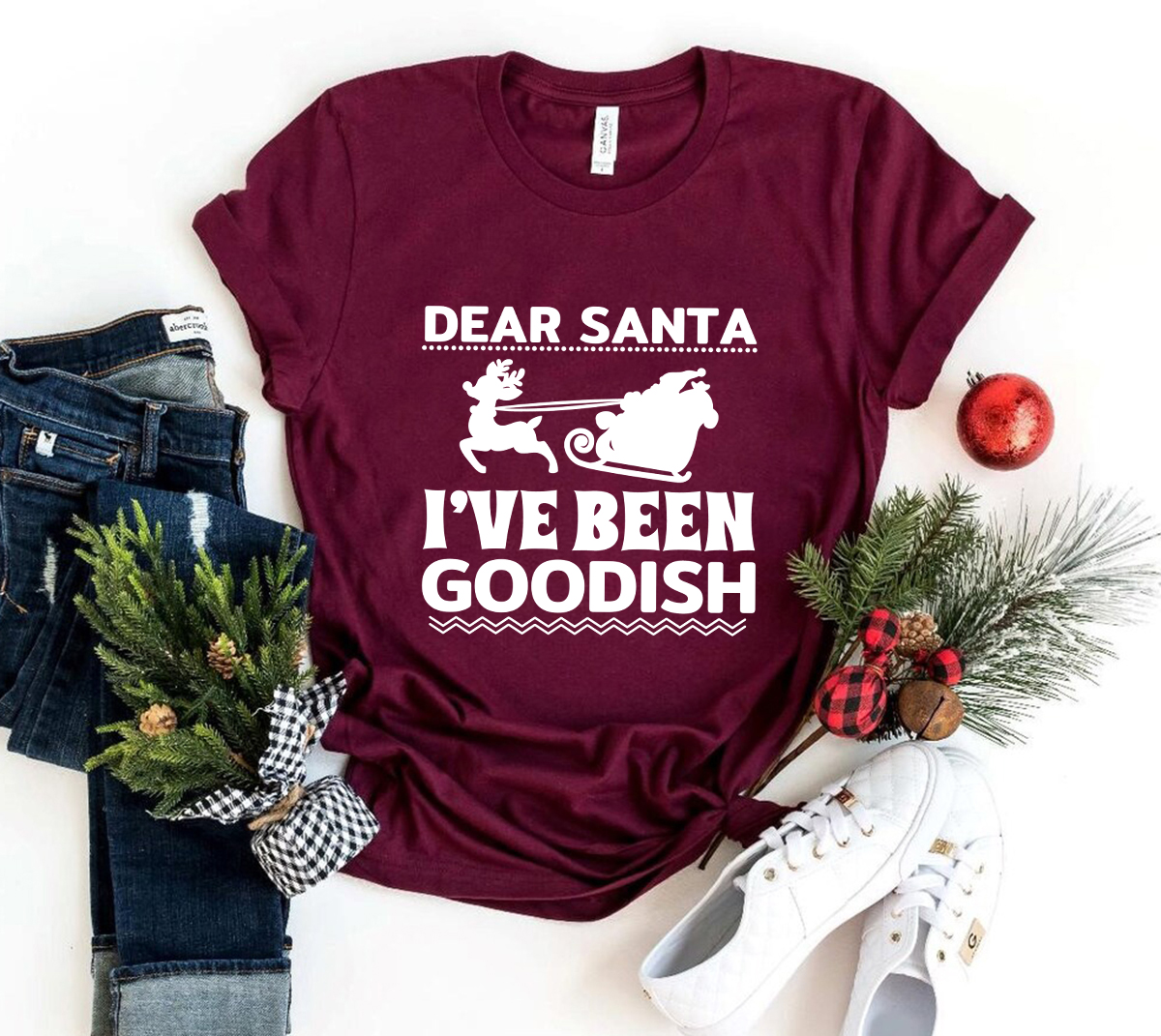 The 'Dear Santa I've Been Goodish Shirt' features a slightly slimmer body and shorter sleeves, giving it a modern fit that flatters all body types. The classic crew neck design is versatile and can be paired with jeans, shorts, or skirts for a casual yet stylish appearance. Whether you're lounging at home or attending a holiday party, this shirt will keep you looking great.