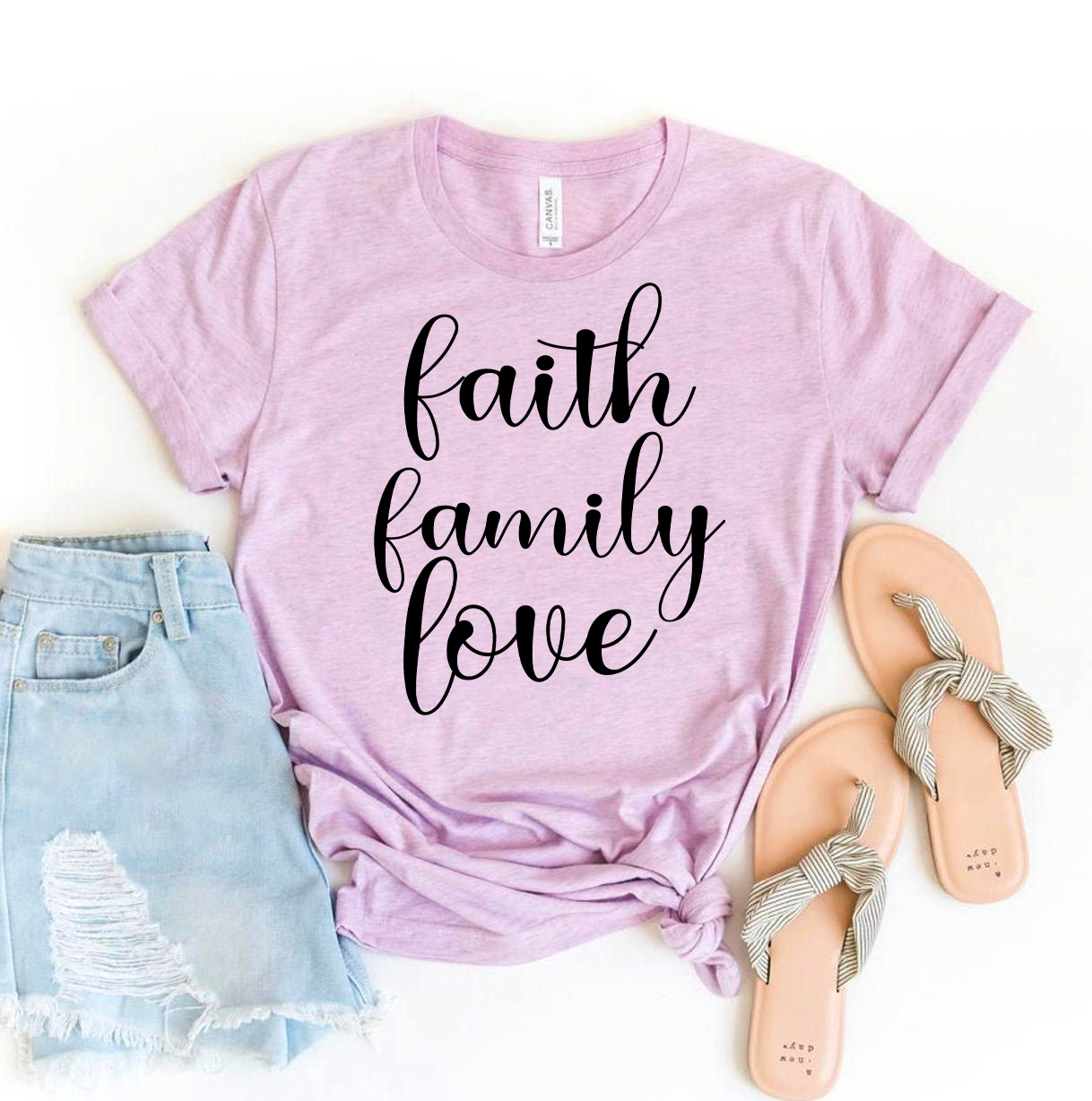 This t-shirt is not just a piece of clothing; it's a statement. Perfect for family gatherings, church events, or casual outings, the Faith Family Love T-shirt can be paired with jeans, shorts, or even layered under a jacket for a trendy look. Its versatility makes it a must-have addition to your wardrobe.