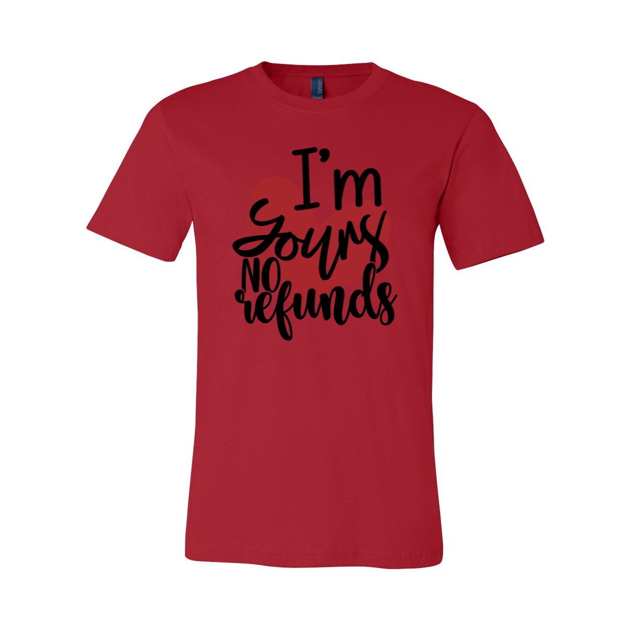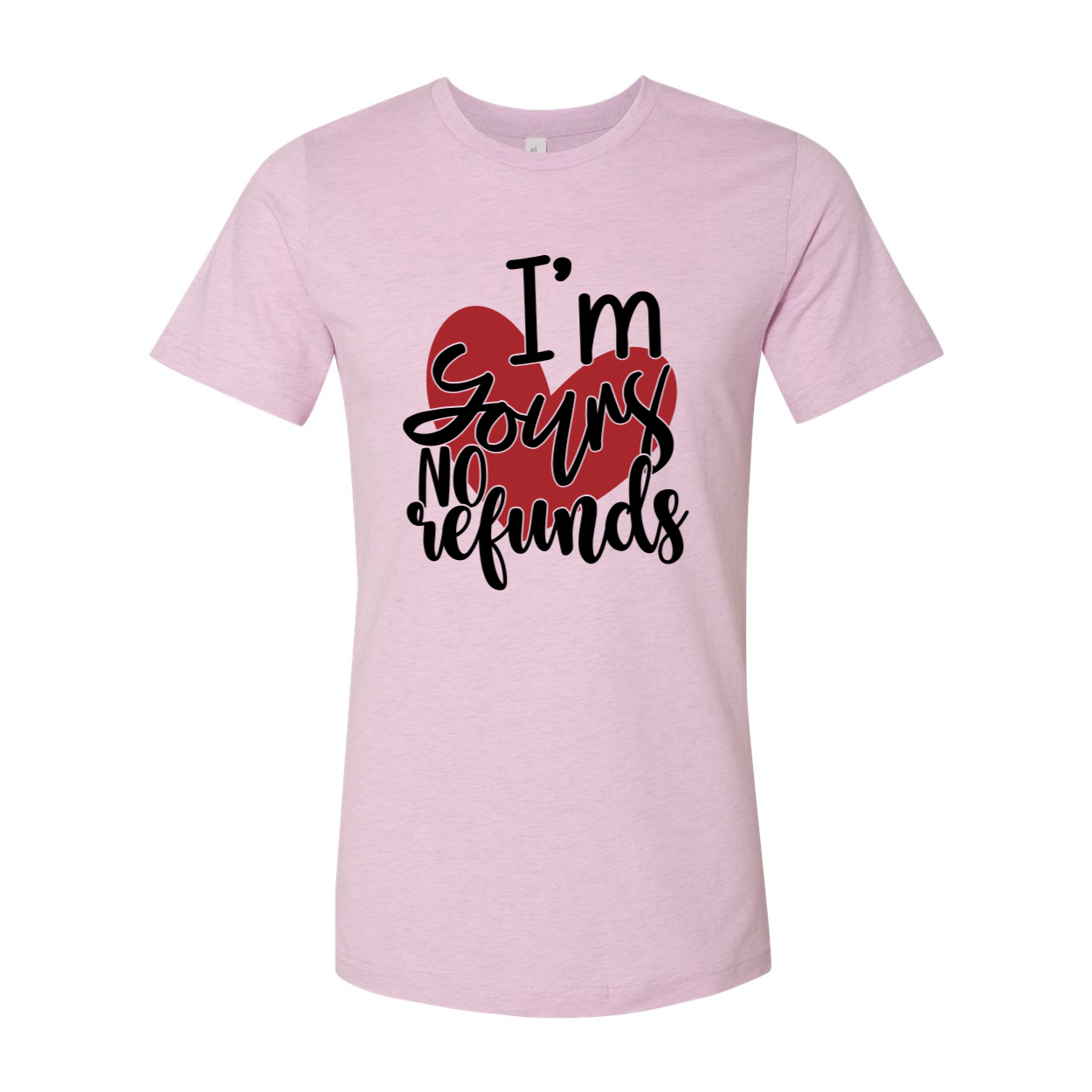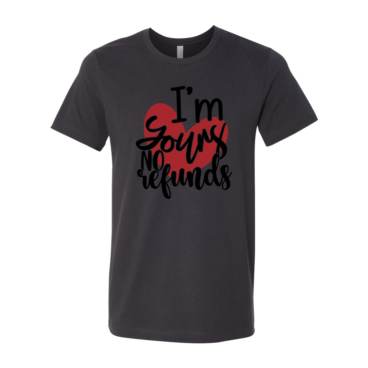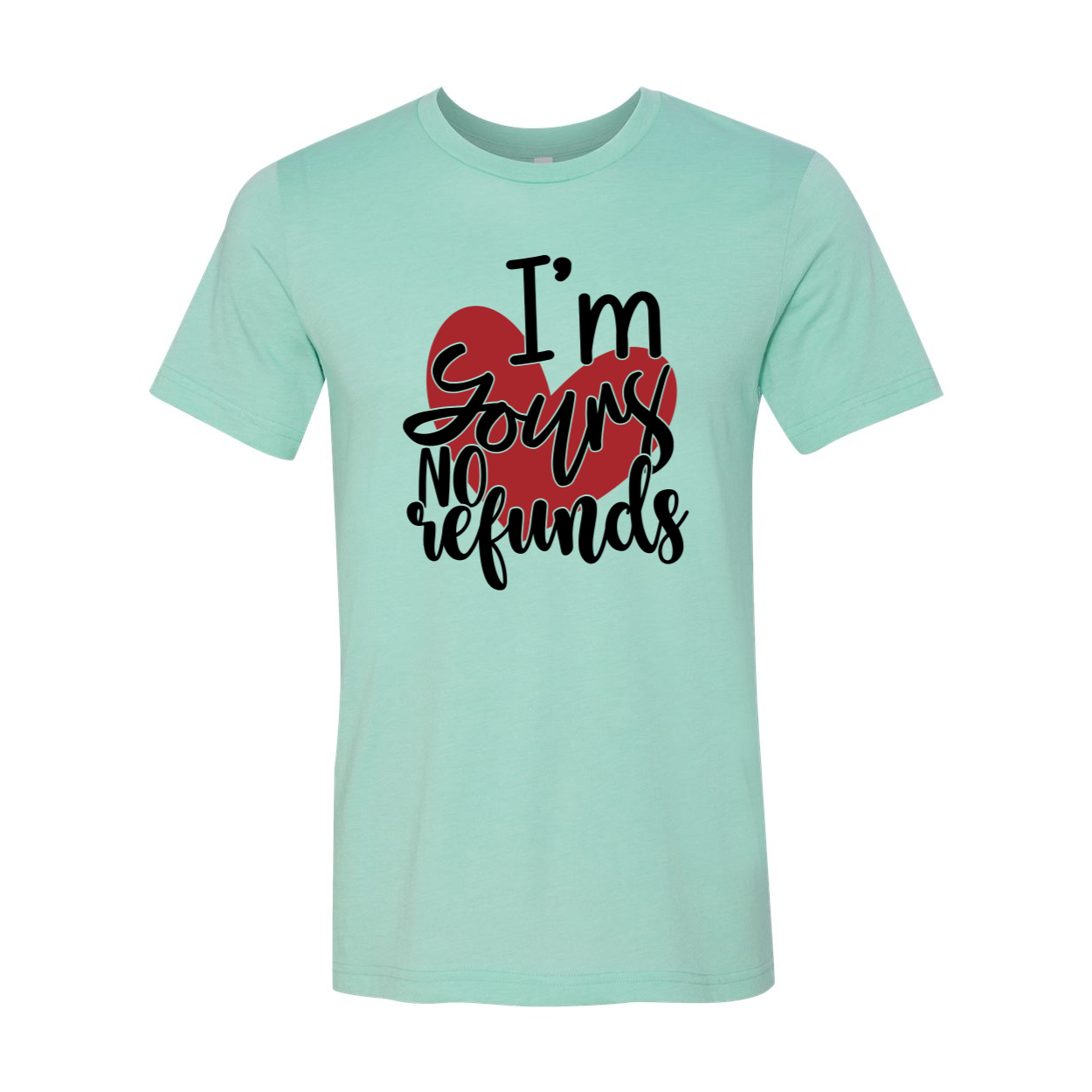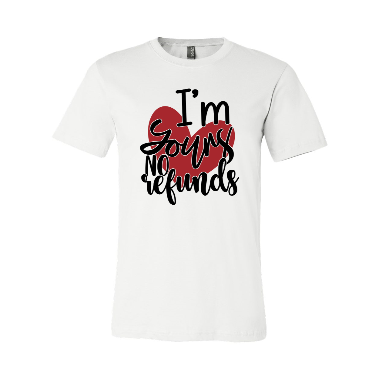 The I'm Yours No Refunds Shirt features a slightly slimmer body and shorter sleeves, giving it a modern and stylish silhouette. The classic crew neck design ensures a comfortable fit, while the 1x1 rib knit neck adds a touch of sophistication. The tear-away label enhances comfort, allowing you to wear this shirt without any irritation.