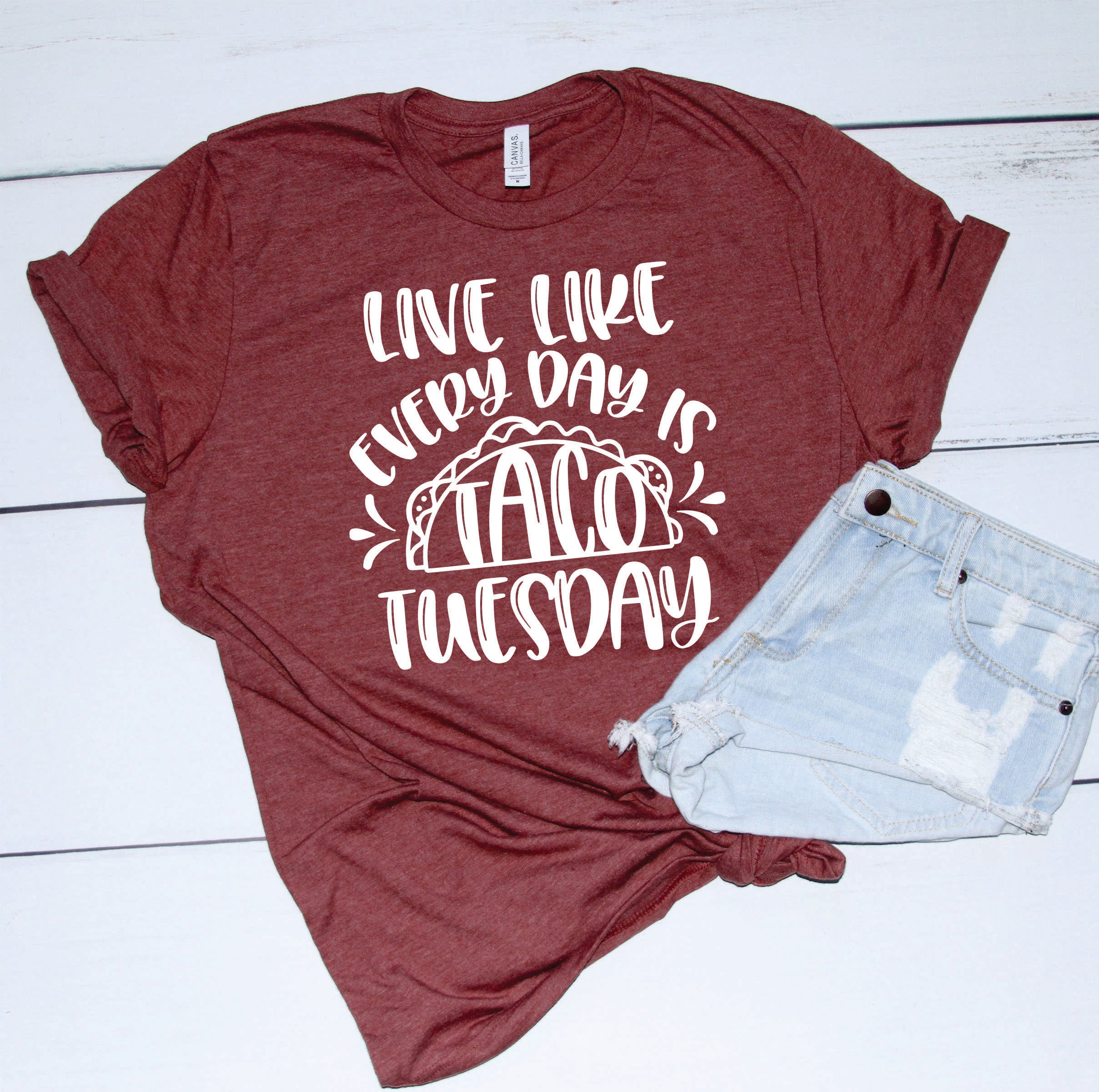 Embrace the spirit of Taco Tuesday every day with the 'LIVE LIKE EVERYDAY IS TACO TUESDAY' graphic tee. It's more than just a shirt; it's a celebration of good food, good times, and a carefree attitude. Don't miss out on adding this fun piece to your wardrobe!