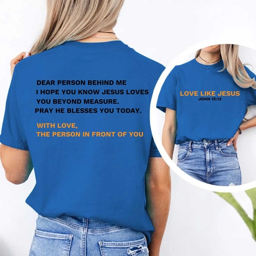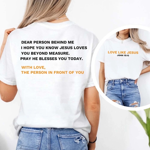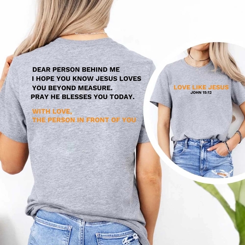 Introducing the Love Like Jesus Dear Person Behind Me Tee, a unique and stylish way to express your faith while staying comfortable. This tee is not just a piece of clothing; it's a statement that resonates with those around you. Prepare to receive compliments and engage in meaningful conversations as you wear this eye-catching shirt.