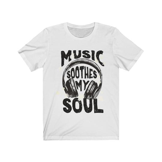 Show off your passion for music with this stylish t-shirt. The phrase 'Music Soothes my Soul' resonates with many, making it a great conversation starter. Whether you're a musician, a concert-goer, or simply someone who enjoys the power of music, this shirt is a perfect addition to your collection.