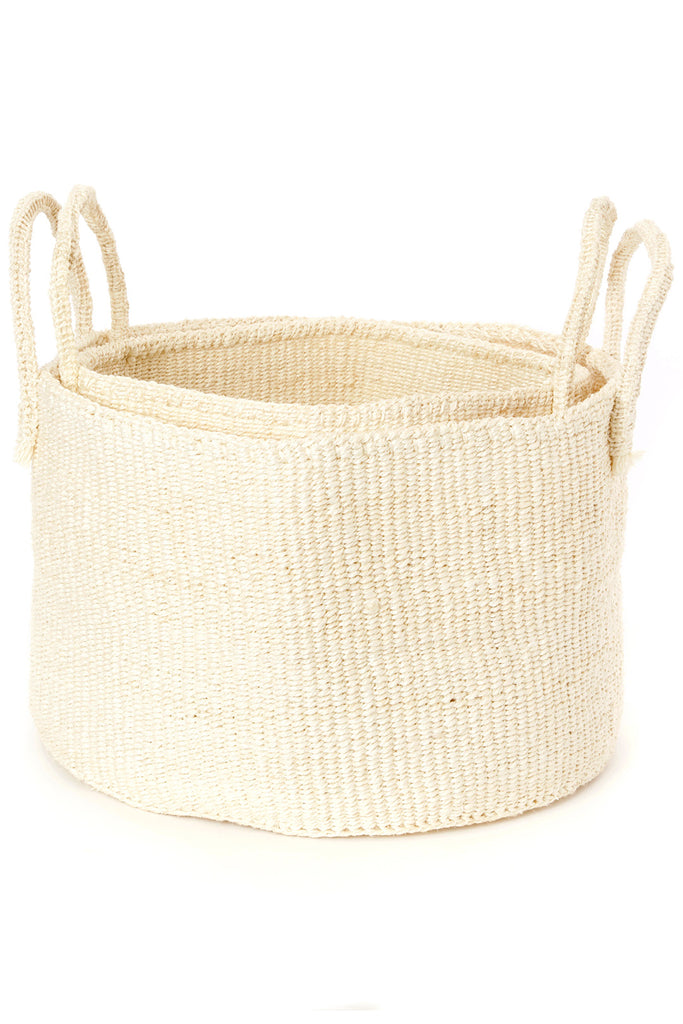 Handwoven natural sisal and fibre African floor storage baskets in cream color, showcasing their unique handcrafted design and durability.