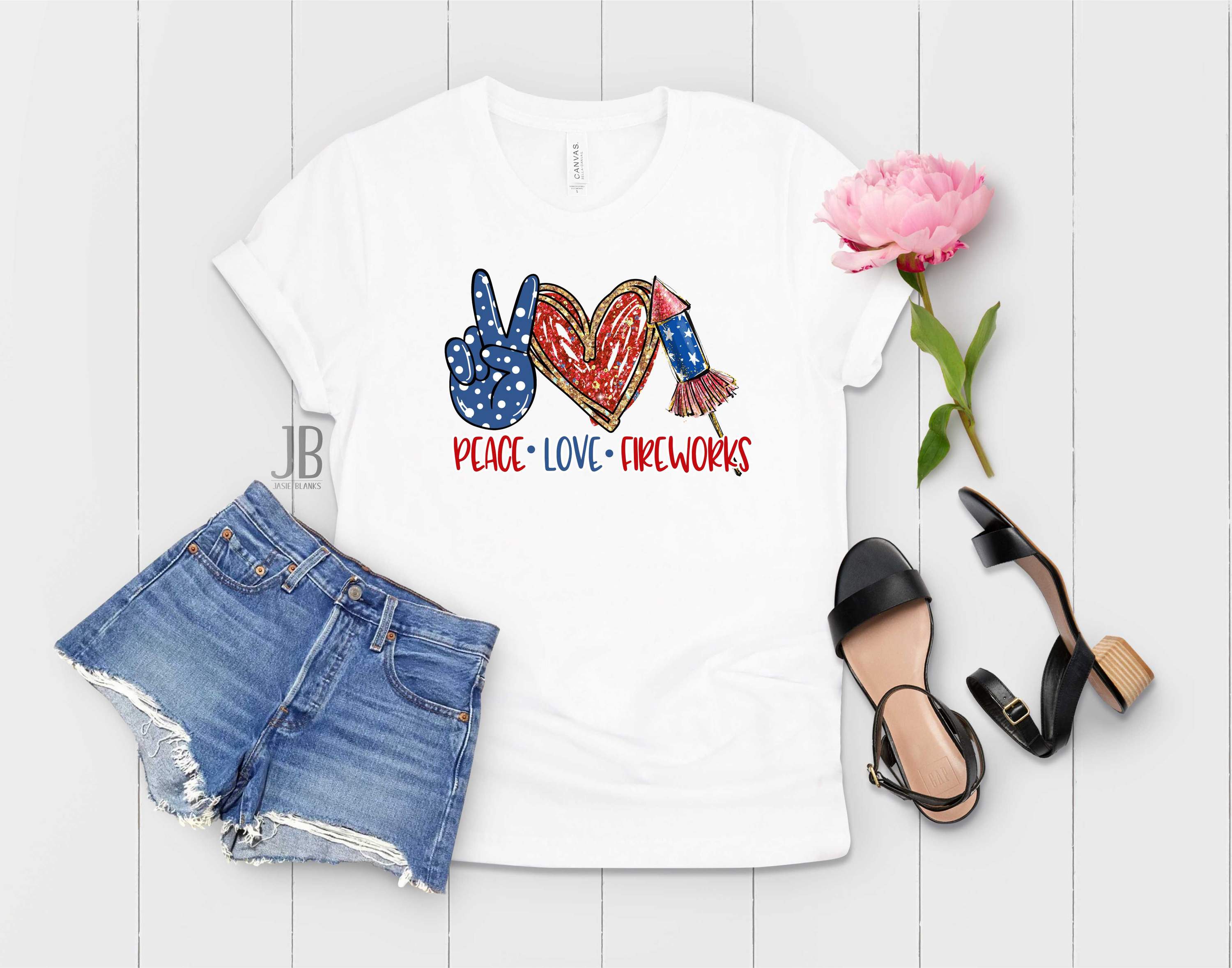 In summary, the Peace Love Fireworks Graphic Tee is a must-have for anyone looking to add a touch of fun and style to their summer wardrobe. With its comfortable fit, durable fabric, and eye-catching design, it's perfect for any occasion. Don't miss out on the chance to showcase your love for summer festivities with this fantastic t-shirt!