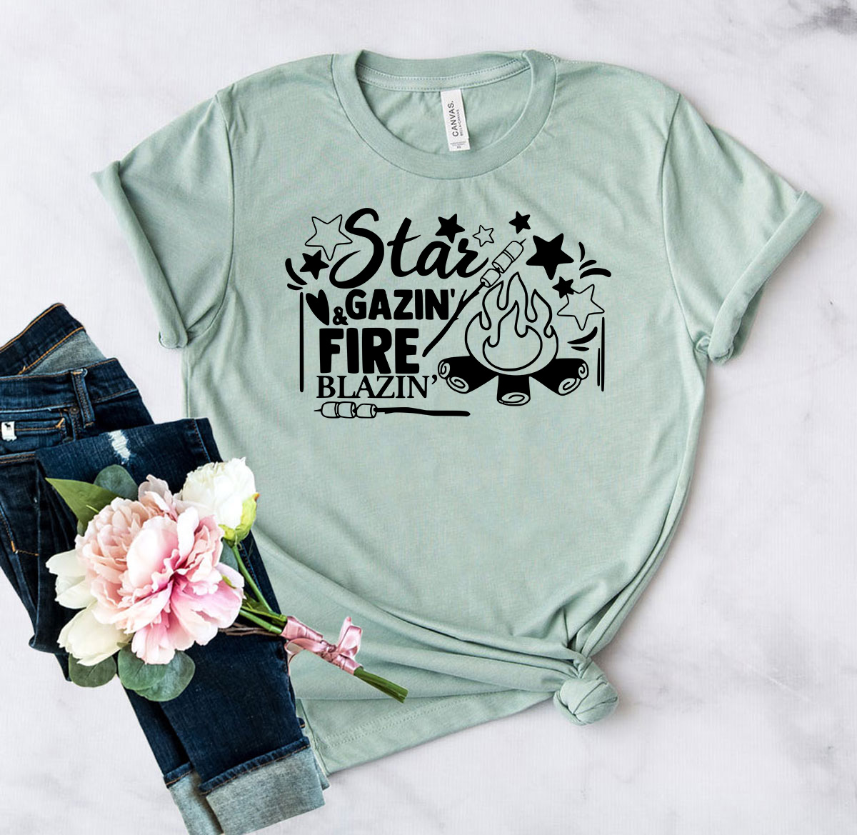 Whether you're heading to a casual outing, running errands, or simply relaxing at home, the Star And Gazin Fire Blazin Shirt is the perfect choice. Its versatile design allows it to be paired with jeans, shorts, or even layered under a jacket for a stylish look. This T-shirt is not just a piece of clothing; it's a statement of comfort and style.