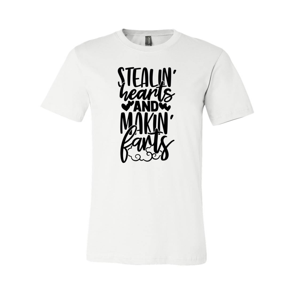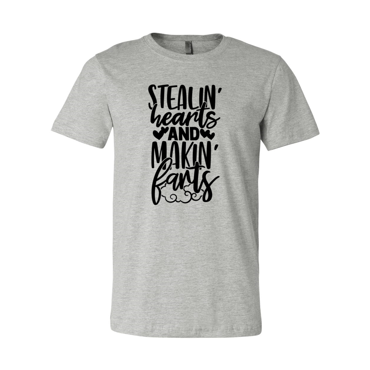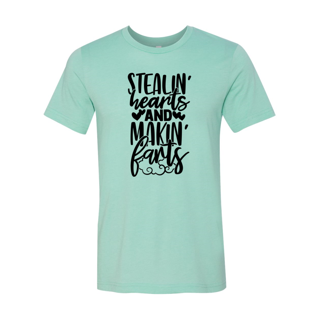 A unisex T-shirt featuring the humorous phrase 'Stealin Hearts And Makin Farts' printed in vibrant colors on a soft cotton fabric.