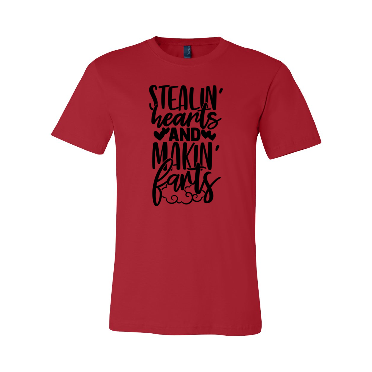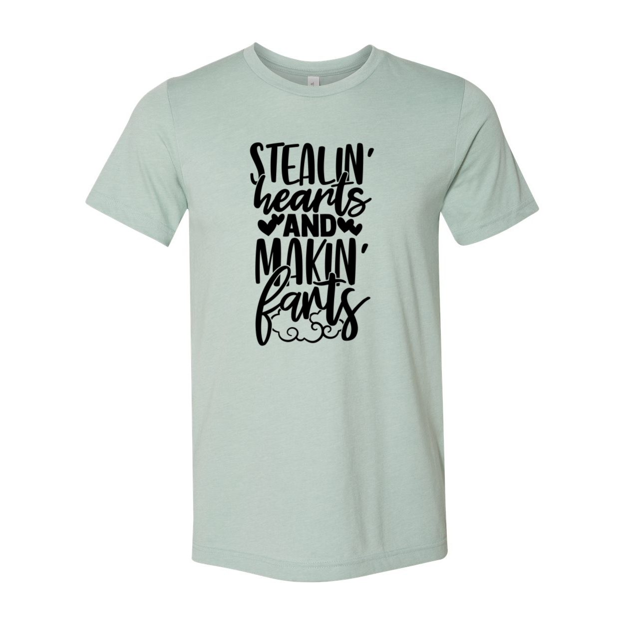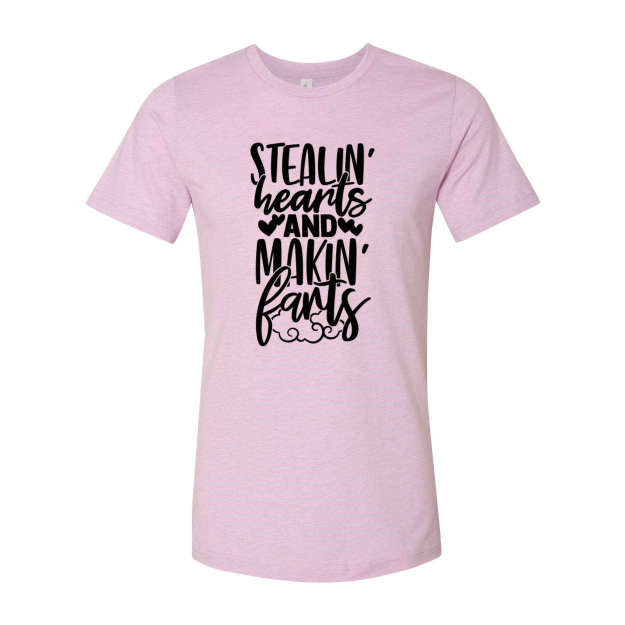 A unisex T-shirt featuring the humorous phrase 'Stealin Hearts And Makin Farts' printed in vibrant colors on a soft cotton fabric.