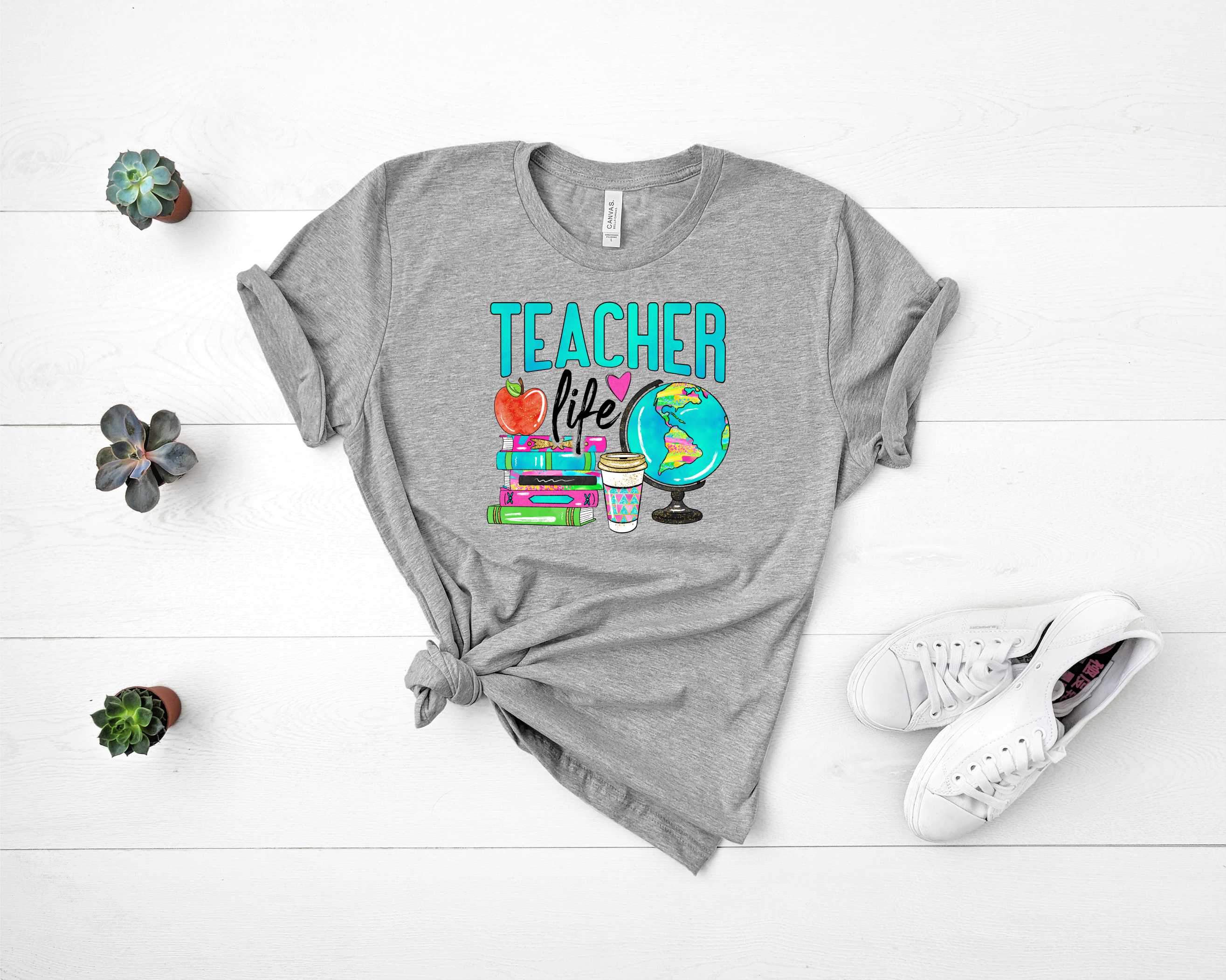 The Teacher Life Graphic Tee is versatile enough to be worn in various settings. Pair it with jeans for a casual look, or dress it up with a blazer for a more professional appearance. It's perfect for teacher conferences, school spirit days, or simply running errands. No matter where you wear it, you'll be sure to turn heads and spark conversations.