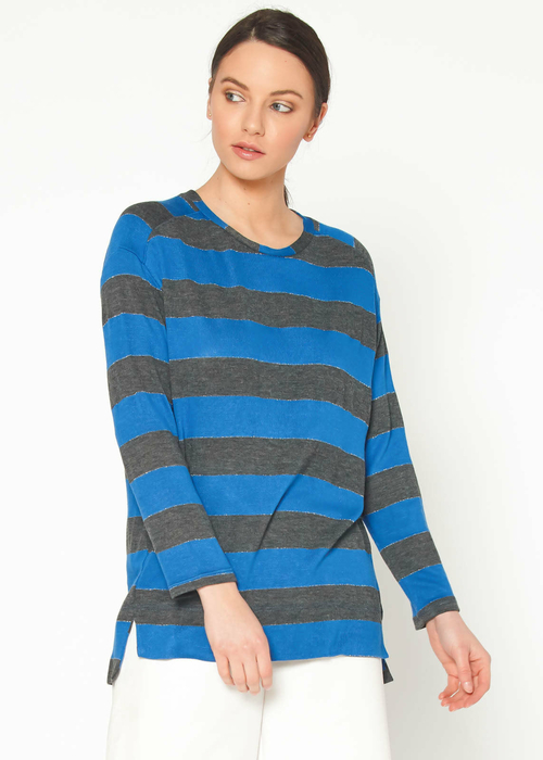 Introducing the Women's Long Sleeve Crewneck Stripe Tee, a perfect blend of style and comfort. This tee is designed for the modern woman who values both fashion and functionality. The striking stripe print is complemented by a luxurious gold lurex detail, making it an ideal choice for both casual outings and more formal occasions. Crafted from a high-quality blend of materials, this tee ensures a comfortable fit while maintaining its shape and style.