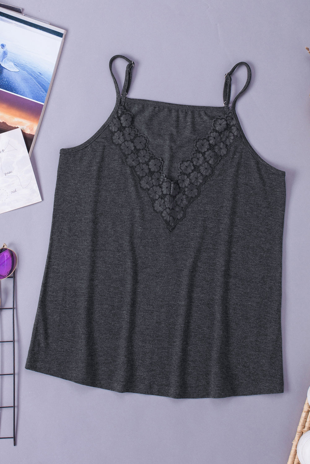 The Black Lace Splicing Camisole Top is a must-have addition to any fashion-forward woman's wardrobe. This stunning camisole features a delicate lace splicing design that adds a touch of elegance and sophistication to your outfit. The v-neckline beautifully frames the face and enhances the wearer's neck and shoulder line, making it an ideal choice for both casual outings and more formal occasions.