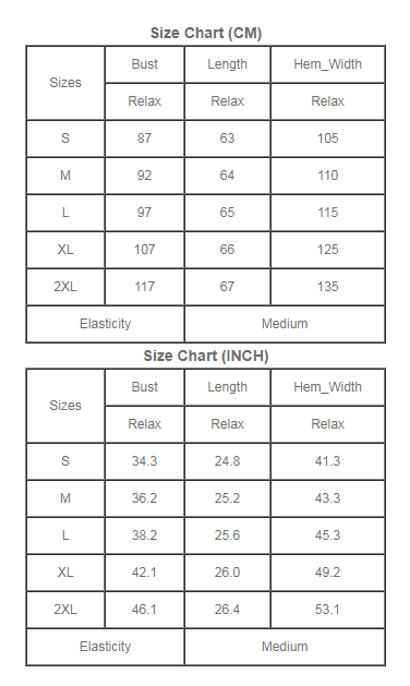 | Sizes | Bust (inches) | Length (inches) | Hem Width (inches) |